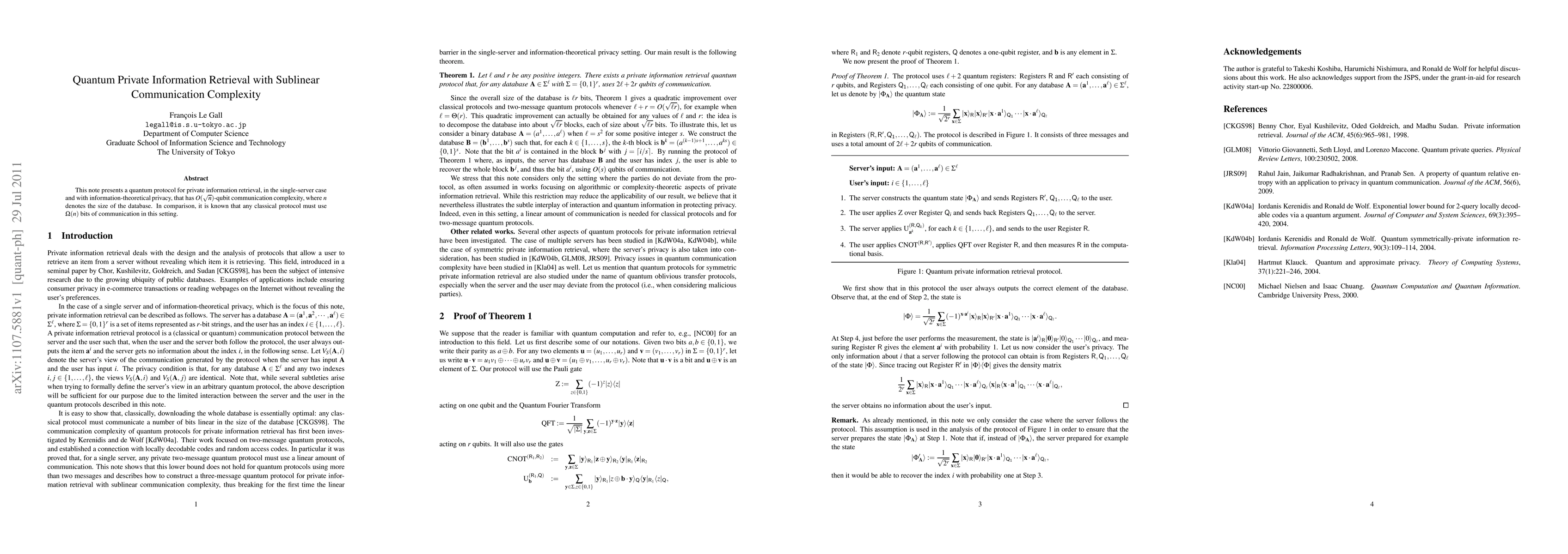 This paper introduces a quantum protocol for private information retrieval with O(√n)-qubit communication complexity, significantly improving upon classical protocols that require Ω(n) bits, achieving information-theoretical privacy in a single-server setting.
