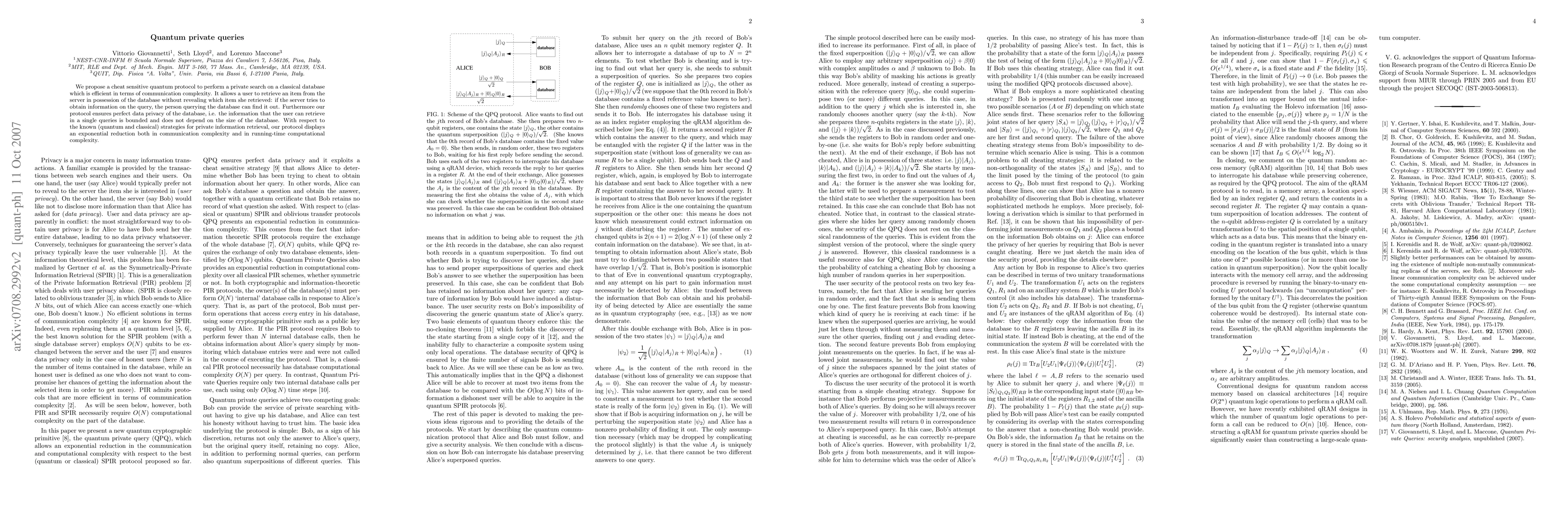 This paper introduces a quantum protocol for private search queries on classical databases, ensuring data privacy and cheat sensitivity. It achieves exponential reductions in communication and computational complexity compared to existing methods.