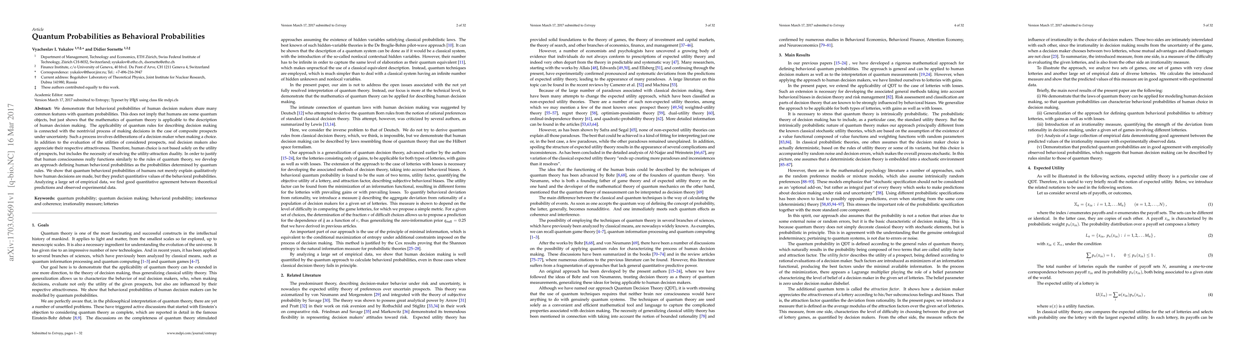 This paper demonstrates that human decision-making probabilities exhibit features similar to quantum probabilities, suggesting that quantum theory's mathematical framework can describe human choices. The study finds strong quantitative agreement between theoretical predictions based on quantum rules and empirical data, indicating that human consciousness processes decisions in a manner akin to quantum mechanics.