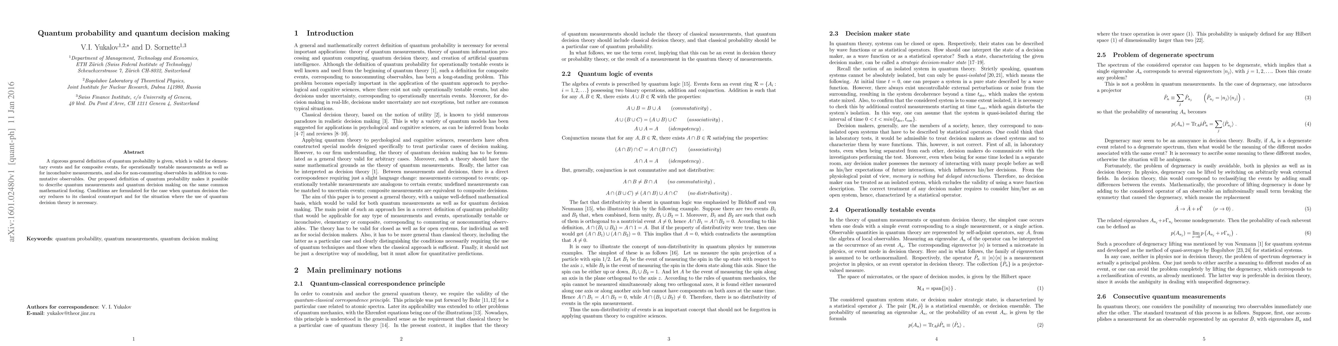 This paper presents a comprehensive definition of quantum probability applicable to both elementary and composite events, encompassing both testable and inconclusive measurements, and both commuting and non-commuting observables. It unifies quantum measurements and decision-making under a common mathematical framework, detailing when quantum decision theory is necessary versus when classical theory suffices.