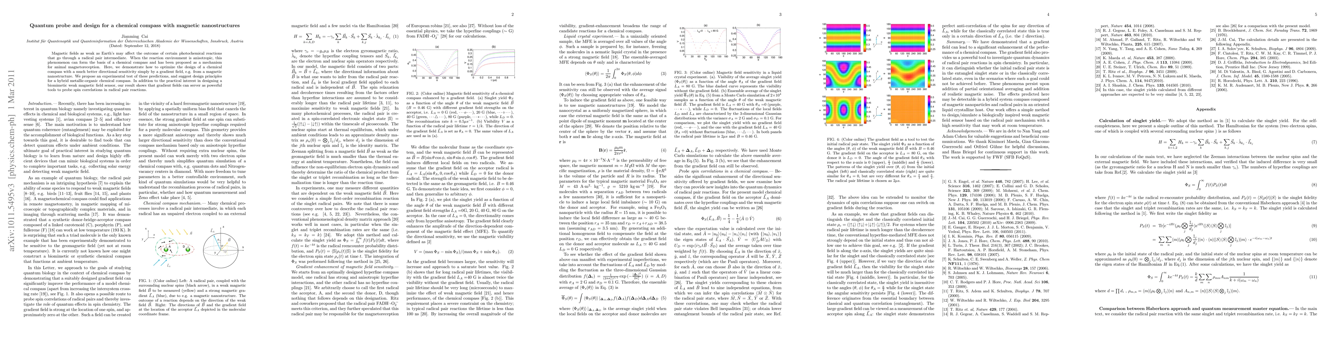 The paper presents a design for a chemical compass using magnetic nanostructures to enhance directional sensitivity to Earth's magnetic fields. It proposes using gradient fields for better performance and suggests experimental tests and design principles for a hybrid metallic-organic sensor. The findings also highlight the potential of gradient fields in probing spin correlations in radical pair reactions.