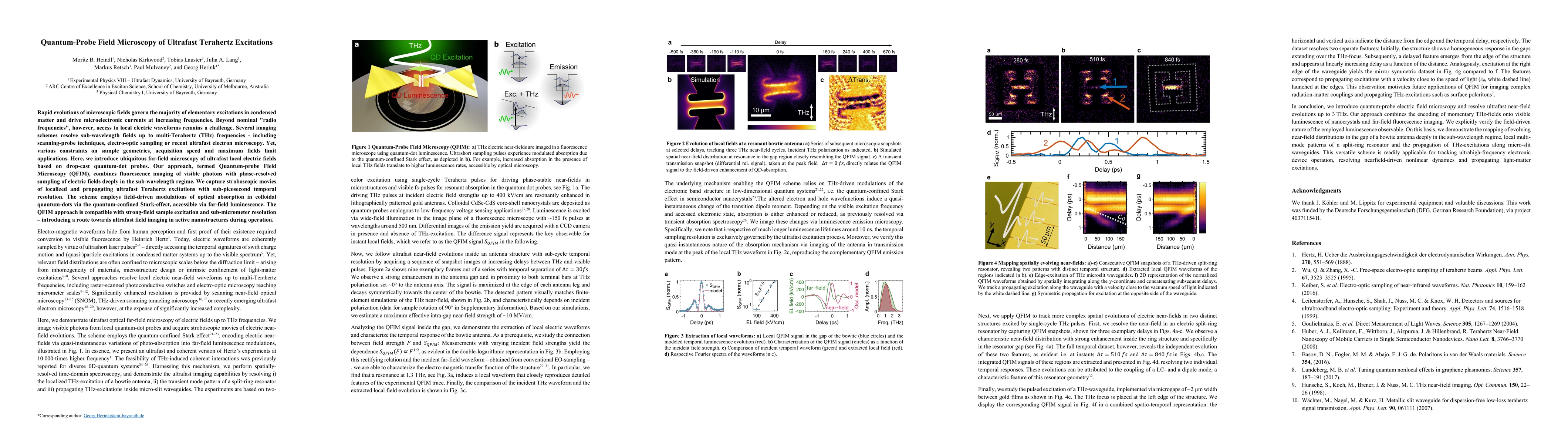This paper introduces Quantum-probe Field Microscopy (QFIM), a novel technique that uses drop-cast quantum-dot probes to image ultrafast Terahertz excitations with sub-picosecond resolution. QFIM combines fluorescence imaging and phase-resolved sampling to capture localized and propagating THz excitations, offering sub-micrometer resolution and compatibility with strong-field sample excitation.