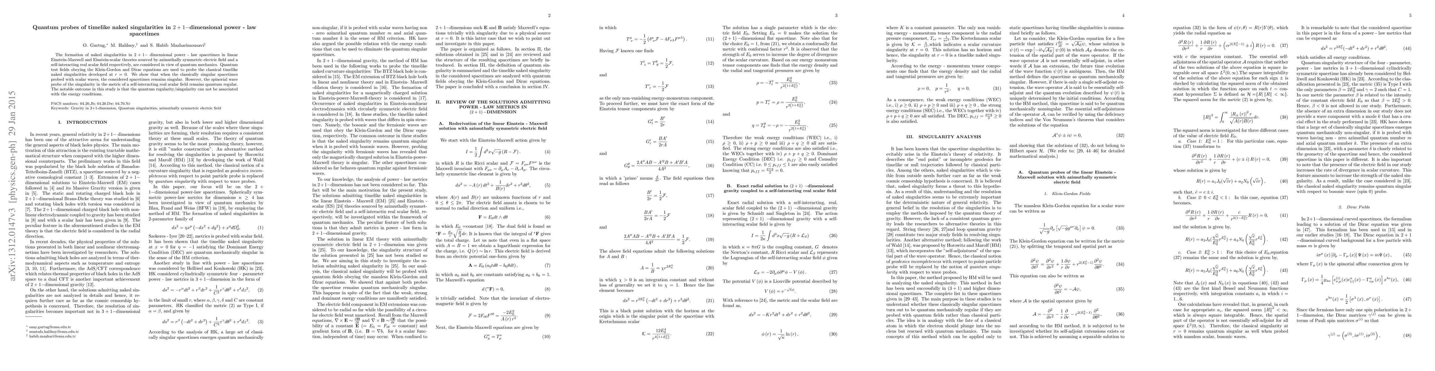 The formation of naked singularities in $2+1-$ dimensional power - law spacetimes in linear Einstein-Maxwell and Einstein-scalar theories sourced by azimuthally symmetric electric field and a self-interacting real scalar field respectively, are considered in view of quantum mechanics. Quantum test fields obeying the Klein-Gordon and Dirac equations are used to probe the classical timelike naked singularities developed at $r=0$. We show that when the classically singular spacetimes probed with scalar waves, the considered spacetimes remains singular. However, the spinorial wave probe of the singularity in the metric of a self-interacting real scalar field remains quantum regular. The notable outcome in this study is that the quantum regularity/singularity can not be associated with the energy conditions.