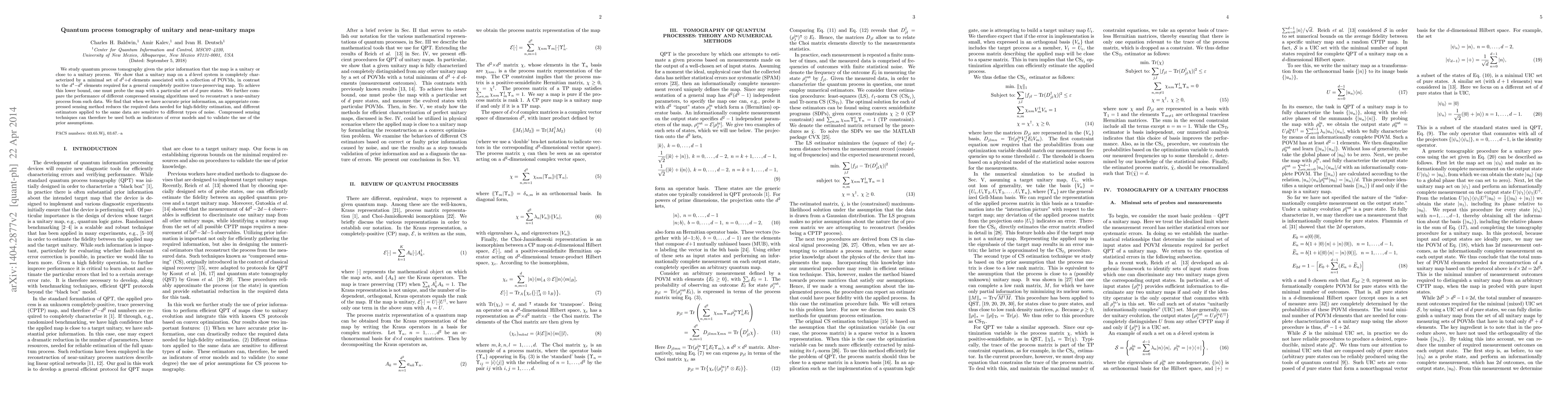 This paper investigates quantum process tomography for unitary and near-unitary maps, demonstrating that a minimal set of $d^2+d$ elements characterizes a unitary map on a $d$-level system, significantly fewer than the $d^4-d^2$ elements required for general maps. It also evaluates compressed sensing algorithms for reconstructing near-unitary processes, showing that accurate prior information can reduce data requirements and that different estimators are sensitive to various noise types.