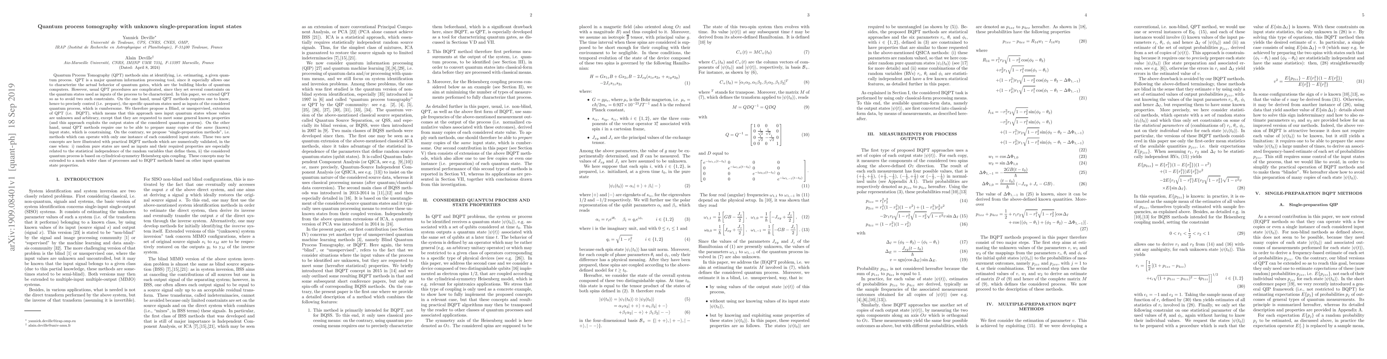 Quantum Process Tomography (QPT) methods aim at identifying, i.e. estimating, a given quantum process. QPT is a major quantum information processing tool, since it especially allows one to characterize the actual behavior of quantum gates, which are the building blocks of quantum computers. However, usual QPT procedures are complicated, since they set several constraints on the quantum states used as inputs of the process to be characterized. In this paper, we extend QPT so as to avoid two such constraints. On the one hand, usual QPT methods requires one to know, hence to precisely control (i.e. prepare), the specific quantum states used as inputs of the considered quantum process, which is cumbersome. We therefore propose a Blind, or unsupervised, extension of QPT (i.e. BQPT), which means that this approach uses input quantum states whose values are unknown and arbitrary, except that they are requested to meet some general known properties (and this approach exploits the output states of the considered quantum process). On the other hand, usual QPT methods require one to be able to prepare many copies of the same (known) input state, which is constraining. On the contrary, we propose "single-preparation methods", i.e. methods which can operate with only one instance of each considered input state. These two new concepts are here illustrated with practical BQPT methods which are numerically validated, in the case when: i) random pure states are used as inputs and their required properties are especially related to the statistical independence of the random variables that define them, ii) the considered quantum process is based on cylindrical-symmetry Heisenberg spin coupling. These concepts may be extended to a much wider class of processes and to BQPT methods based on other input quantum state properties.