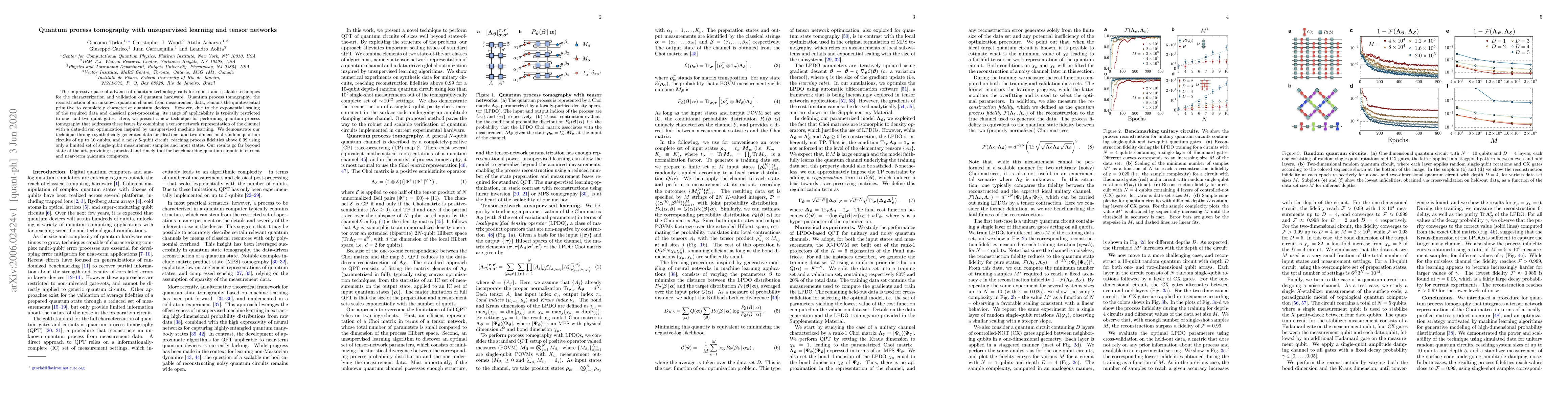 The impressive pace of advance of quantum technology calls for robust and scalable techniques for the characterization and validation of quantum hardware. Quantum process tomography, the reconstruction of an unknown quantum channel from measurement data, remains the quintessential primitive to completely characterize quantum devices. However, due to the exponential scaling of the required data and classical post-processing, its range of applicability is typically restricted to one- and two-qubit gates. Here, we present a new technique for performing quantum process tomography that addresses these issues by combining a tensor network representation of the channel with a data-driven optimization inspired by unsupervised machine learning. We demonstrate our technique through synthetically generated data for ideal one- and two-dimensional random quantum circuits of up to 10 qubits, and a noisy 5-qubit circuit, reaching process fidelities above 0.99 using only a limited set of single-qubit measurement samples and input states. Our results go far beyond state-of-the-art, providing a practical and timely tool for benchmarking quantum circuits in current and near-term quantum computers.