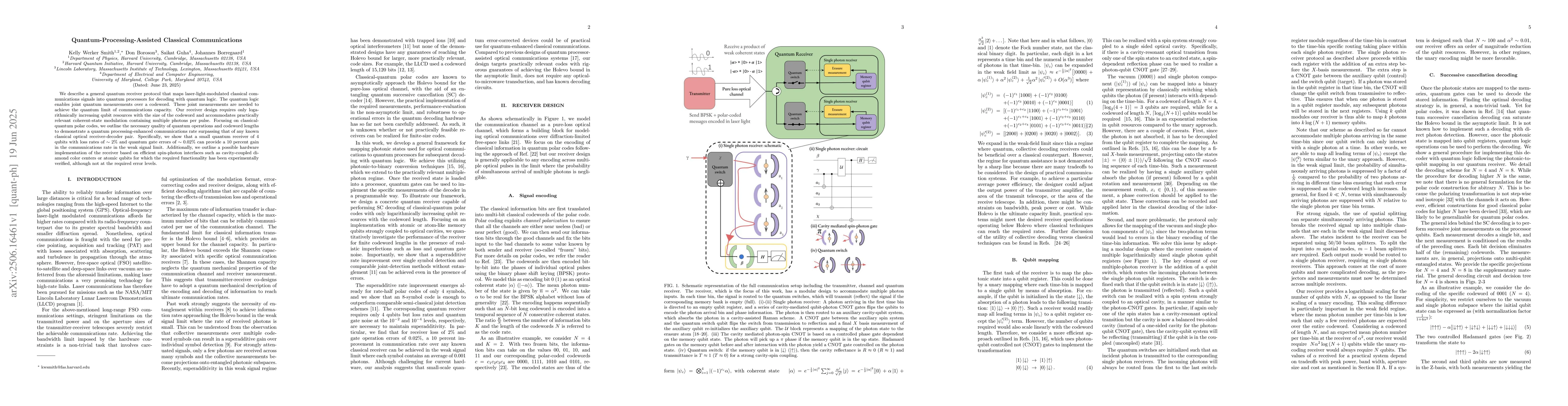 We describe a general quantum receiver protocol that maps laser-light-modulated classical communications signals into quantum processors for decoding with quantum logic. The quantum logic enables joint quantum measurements over a codeword. These joint measurements are needed to achieve the quantum limit of communications capacity. Our receiver design requires only logarithmically increasing qubit resources with the size of the codeword and accommodates practically relevant coherent-state modulation containing multiple photons per pulse. Focusing on classical-quantum polar codes, we outline the necessary quality of quantum operations and codeword lengths to demonstrate a quantum processing-enhanced communications rate surpassing that of any known classical optical receiver-decoder pair. Specifically, we show that a small quantum receiver of 4 qubits with loss rates of $\sim 2\%$ and quantum gate errors of $\sim 0.02\%$ can provide a $10$ percent gain in the communications rate in the weak signal limit. Additionally, we outline a possible hardware implementation of the receiver based on efficient spin-photon interfaces such as cavity-coupled diamond color centers or atomic qubits for which the required functionality has been experimentally verified, although not at the required error levels.