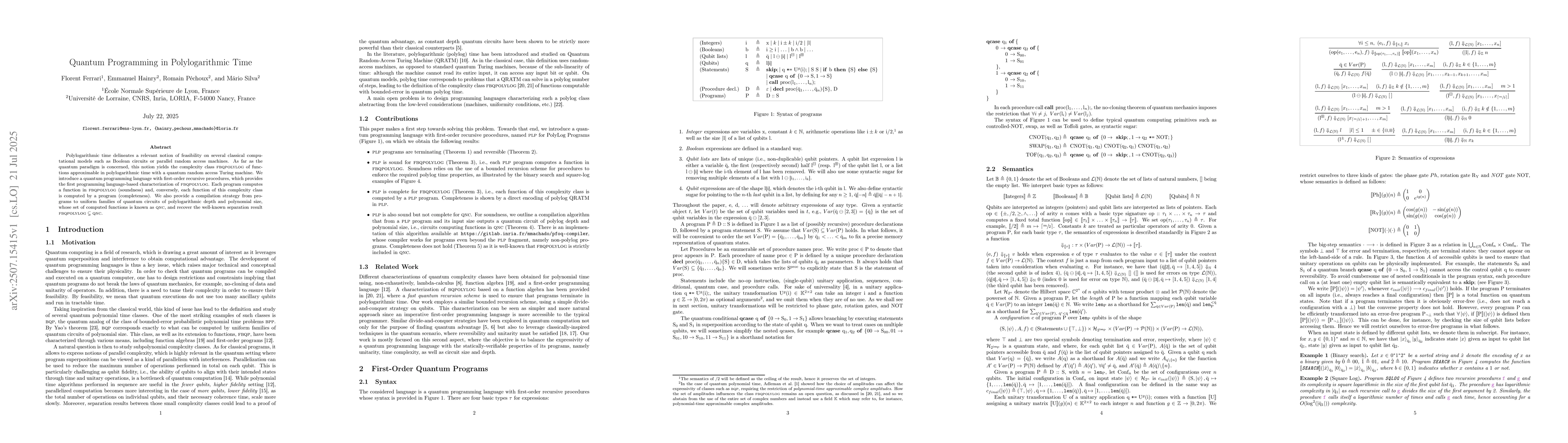 The research introduces a quantum programming language, PLP, with first-order recursive procedures, providing a programming-language-based characterization of FBQPOLYLOG, the class of functions approximable in polylogarithmic time by a quantum random-access Turing machine.