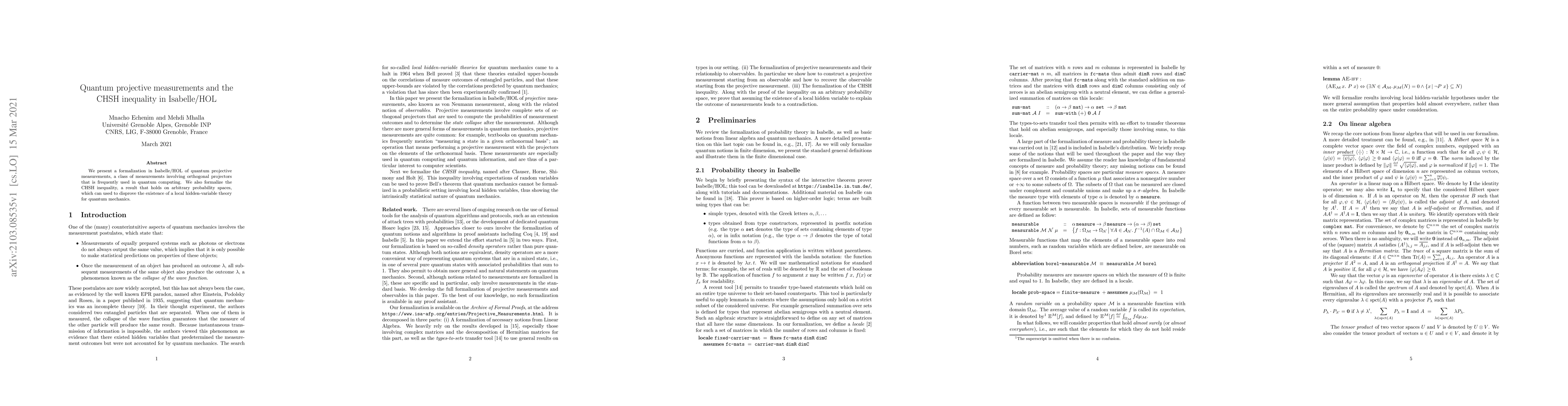 We present a formalization in Isabelle/HOL of quantum projective measurements, a class of measurements involving orthogonal projectors that is frequently used in quantum computing. We also formalize the CHSH inequality, a result that holds on arbitrary probability spaces, which can used to disprove the existence of a local hidden-variable theory for quantum mechanics.