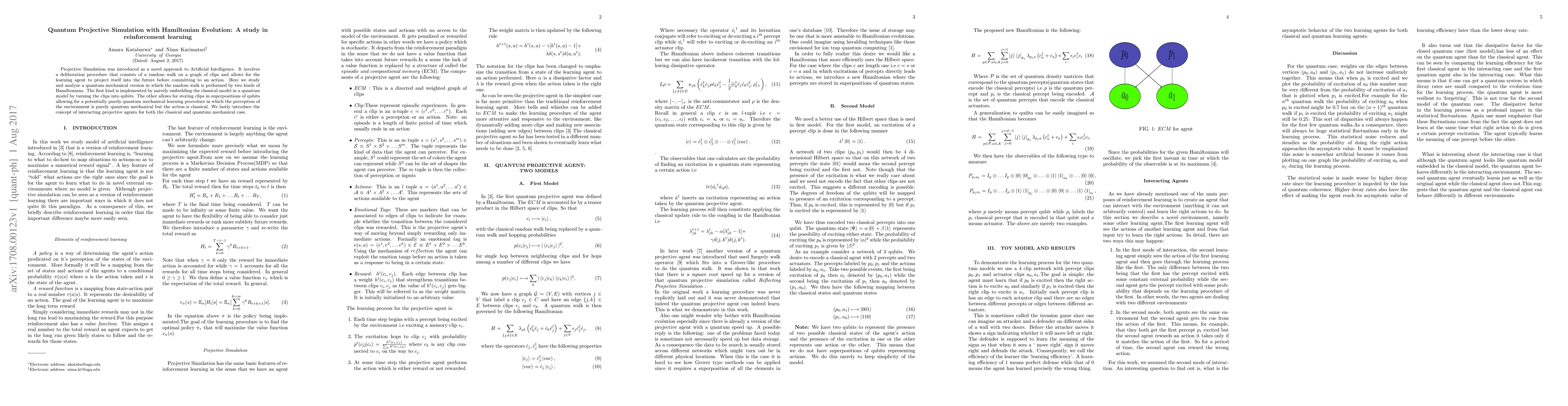 Projective Simulation was introduced as a novel approach to Artificial Intelligence. It involves a deliberation procedure that consists of a random walk on a graph of clips and allows for the learning agent to project itself into the future before committing to an action. Here we study and analyze a quantum mechanical version in which the random walk is performed by two kinds of Hamiltonians. The first kind is implemented by naively embedding the classical model in a quantum model by turning the clips into qubits. The other allows for storing clips in superpositions of qubits allowing for a potentially purely quantum mechanical learning procedure in which the perception of the environment is purely quantum mechanical but the action is classical. We lastly introduce the concept of interacting projective agents for both the classical and quantum mechanical case.