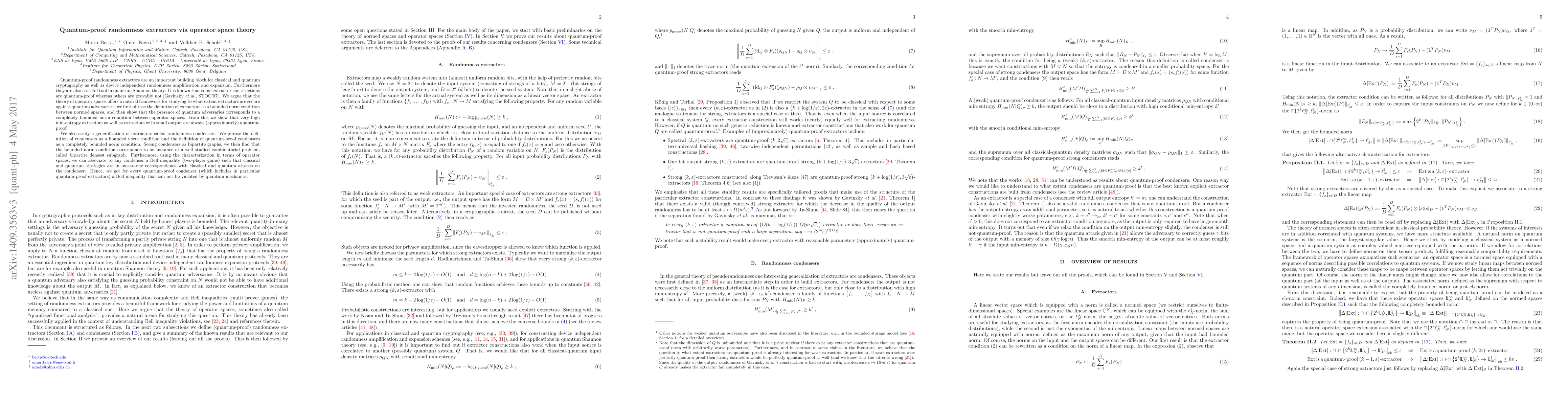This paper explores quantum-proof randomness extractors using operator space theory, demonstrating that high min-entropy extractors and those with small outputs are inherently quantum-proof. It also generalizes extractors to randomness condensers, linking them to bipartite densest subgraph problems and Bell inequalities, showing that quantum-proof condensers cannot violate quantum mechanics.