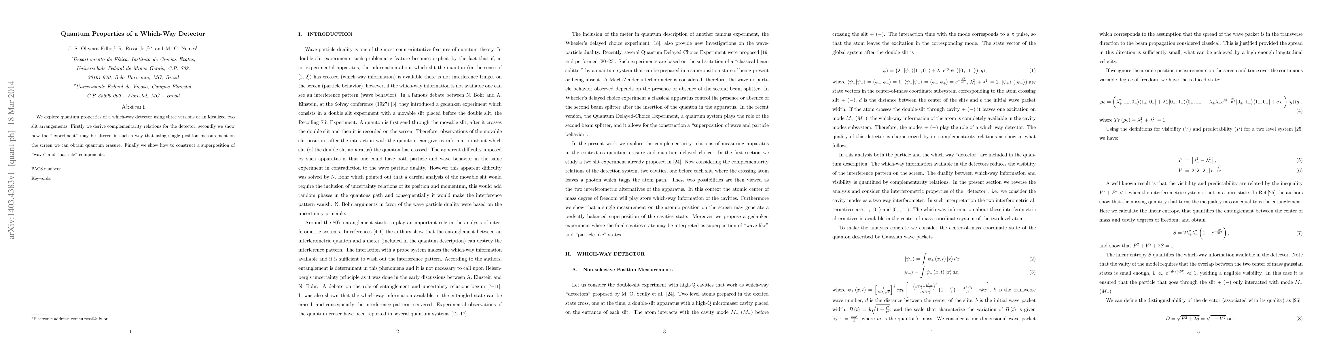 Researchers explored quantum properties of a which-way detector using idealized two-slit arrangements, demonstrating complementarity relations, quantum erasure, and the superposition of wave and particle components.