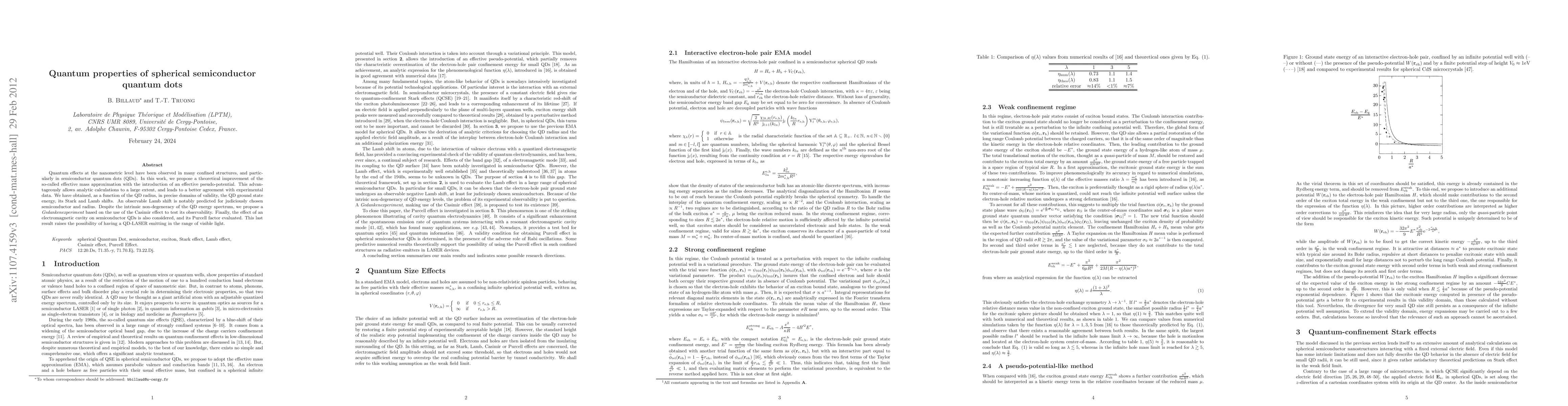 Quantum effects at the nanometric level have been observed in many confined structures, and particularly in semiconductor quantum dots (QDs). In this work, we propose a theoretical improvement of the so-called effective mass approximation with the introduction of an effective pseudo-potential. This advantageously allows analytic calculations to a large extent, and leads to a better agreement with experimental data. We have obtained, as a function of the QD radius, in precise domains of validity, the QD ground state energy, its Stark and Lamb shifts. An observable Lamb shift is notably predicted for judiciously chosen semiconductor and radius. Despite the intrinsic non-degeneracy of the QD energy spectrum, we propose a Gedankenexperiment based on the use of the Casimir effect to test its observability. Finally, the effect of an electromagnetic cavity on semiconductor QDs is also considered, and its Purcell factor evaluated. This last result raises the possibility of having a QD-LASER emitting in the range of visible light.