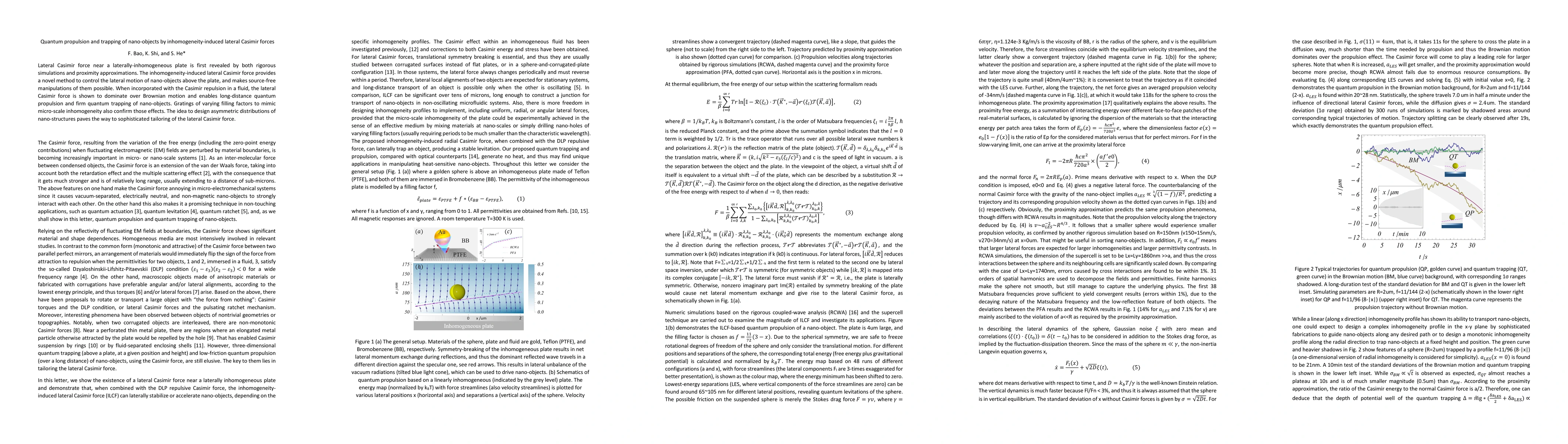 This paper demonstrates the use of inhomogeneity-induced lateral Casimir forces to control the lateral motion of nano-objects above a plate, enabling source-free manipulation. The study shows that this force can dominate over Brownian motion, facilitating long-distance quantum propulsion and effective quantum trapping of nano-objects.