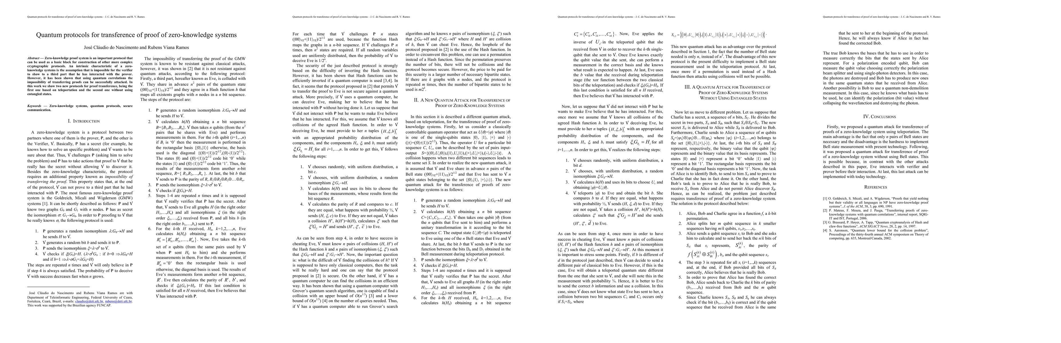 Zero-knowledge proof system is an important protocol that can be used as a basic block for construction of other more complex cryptographic protocols. An intrinsic characteristic of a zero-knowledge systems is the assumption that is impossible for the verifier to show to a third part that he has interacted with the prover. However, it has been shown that using quantum correlations the impossibility of transferring proofs can be successfully attacked. In this work we show two new protocols for proof transference, being the first one based on teleportation and the second one without using entangled states.