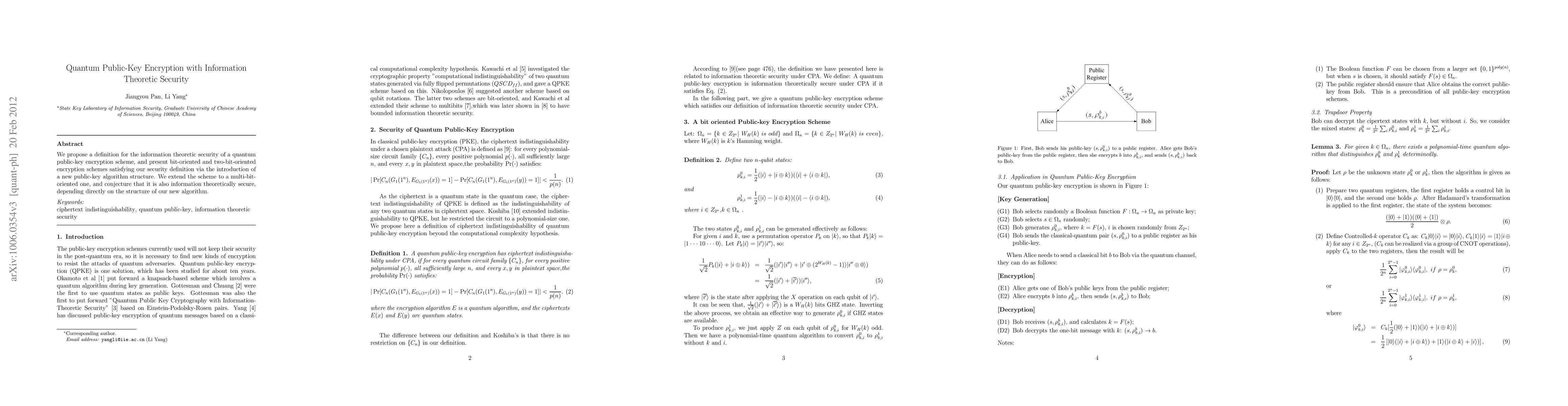 This paper introduces a new definition for information theoretic security in quantum public-key encryption and presents several encryption schemes, including bit-oriented and multi-bit-oriented versions, based on a novel public-key algorithm structure. The authors conjecture that these schemes are information theoretically secure.