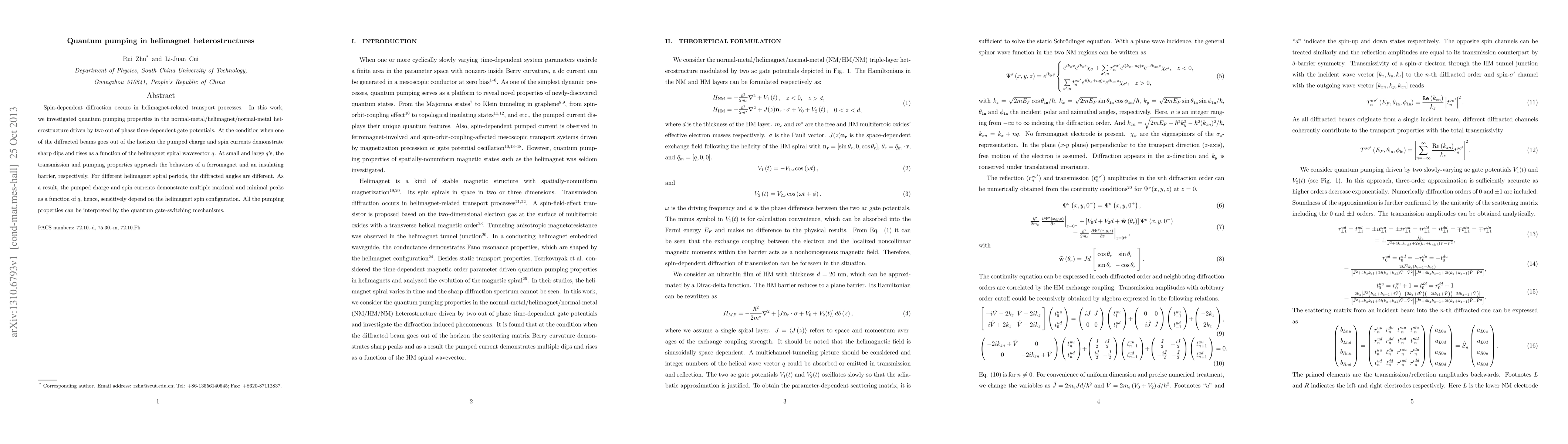 This research investigates quantum pumping in normal-metal/helimagnet/normal-metal heterostructures driven by out-of-phase gate potentials. It finds that pumped charge and spin currents show sharp variations with the helimagnet's spiral wavevector $q$, exhibiting maximal and minimal peaks that depend on the helimagnet's spin configuration and are interpreted through quantum gate-switching mechanisms.