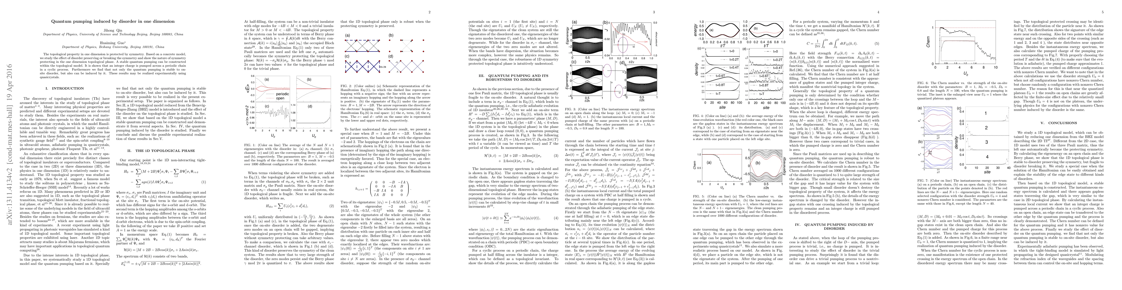 This paper explores quantum pumping in 1D topological models, demonstrating that disorder can induce stable, topologically protected pumping characterized by the Chern number, even when symmetry is preserved or broken. The findings suggest potential experimental realization using quasicrystals.