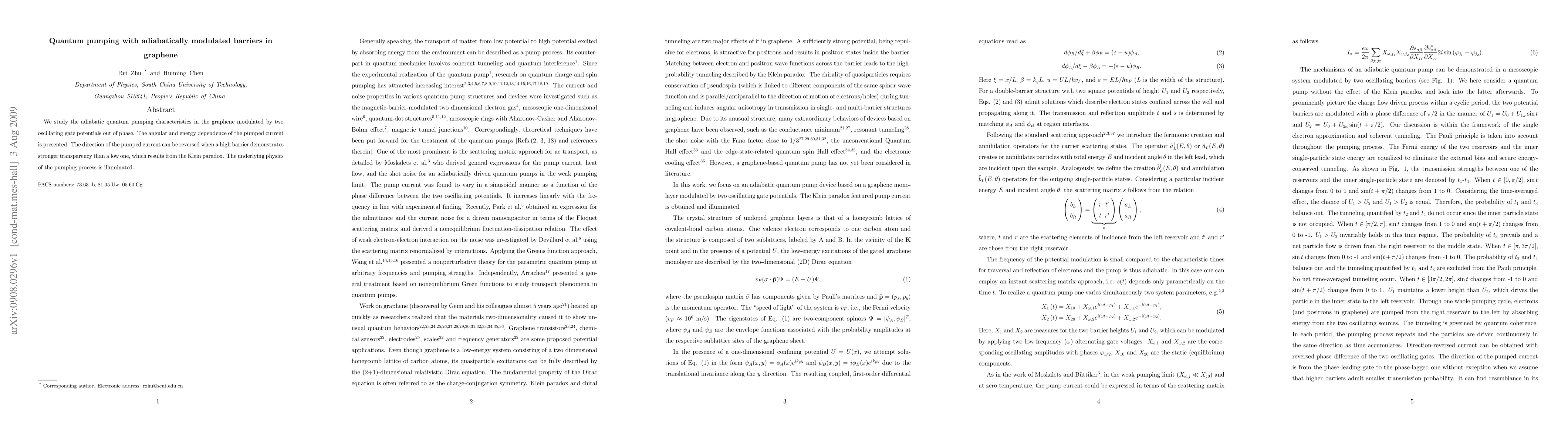 Summary: This study investigates adiabatic quantum pumping in graphene under oscillating gate potentials, revealing that the direction of pumped current can be reversed due to differing barrier transparency influenced by the Klein paradox, highlighting the underlying quantum mechanical effects.