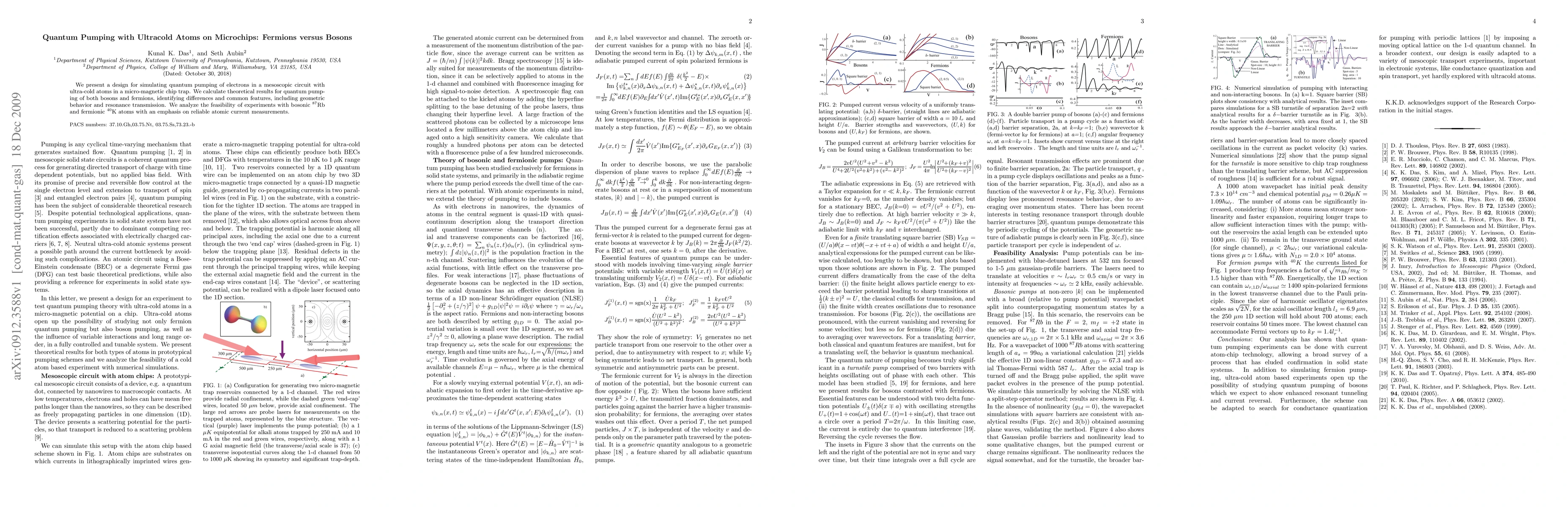 We present a design for simulating quantum pumping of electrons in a mesoscopic circuit with ultra-cold atoms in a micro-magnetic chip trap. We calculate theoretical results for quantum pumping of both bosons and fermions, identifying differences and common features, including geometric behavior and resonance transmission. We analyze the feasibility of experiments with bosonic $^{87}$Rb and fermionic $^{40}$K atoms with an emphasis on reliable atomic current measurements.