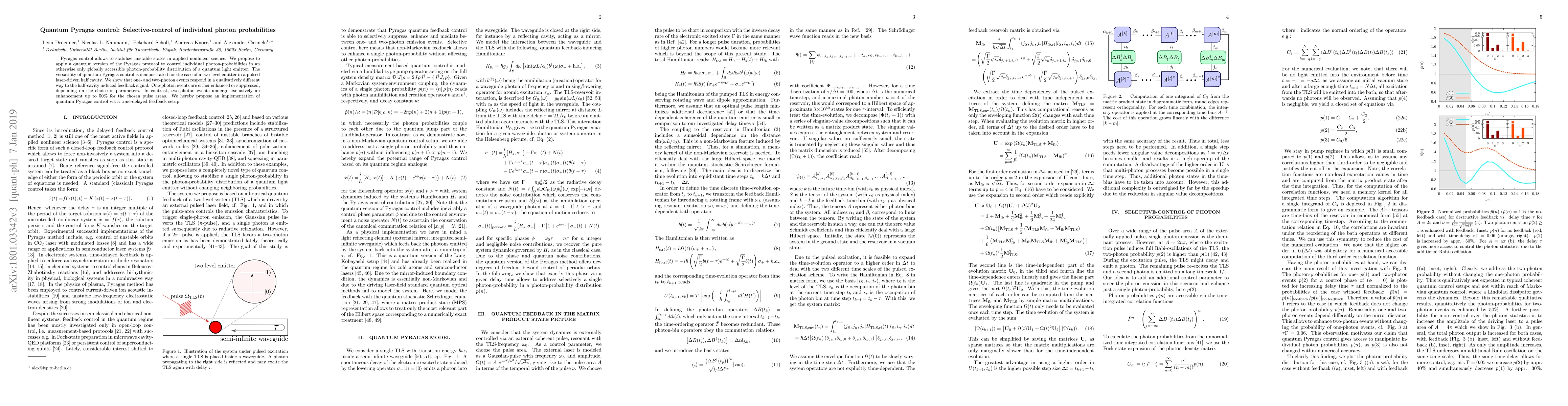 Pyragas control allows to stabilize unstable states in applied nonlinear science. We propose to apply a quantum version of the Pyragas protocol to control individual photon-probabilities in an otherwise only globally accessible photon-probability distribution of a quantum light emitter. The versatility of quantum Pyragas control is demonstrated for the case of a two-level emitter in a pulsed laser-driven half cavity. We show that one- and two-photon events respond in a qualitatively different way to the half-cavity induced feedback signal. One-photon events are either enhanced or suppressed, depending on the choice of parameters. In contrast, two-photon events undergo exclusively an enhancement up to $50\%$ for the chosen pulse areas. We hereby propose an implementation of quantum Pyragas control via a time-delayed feedback setup.