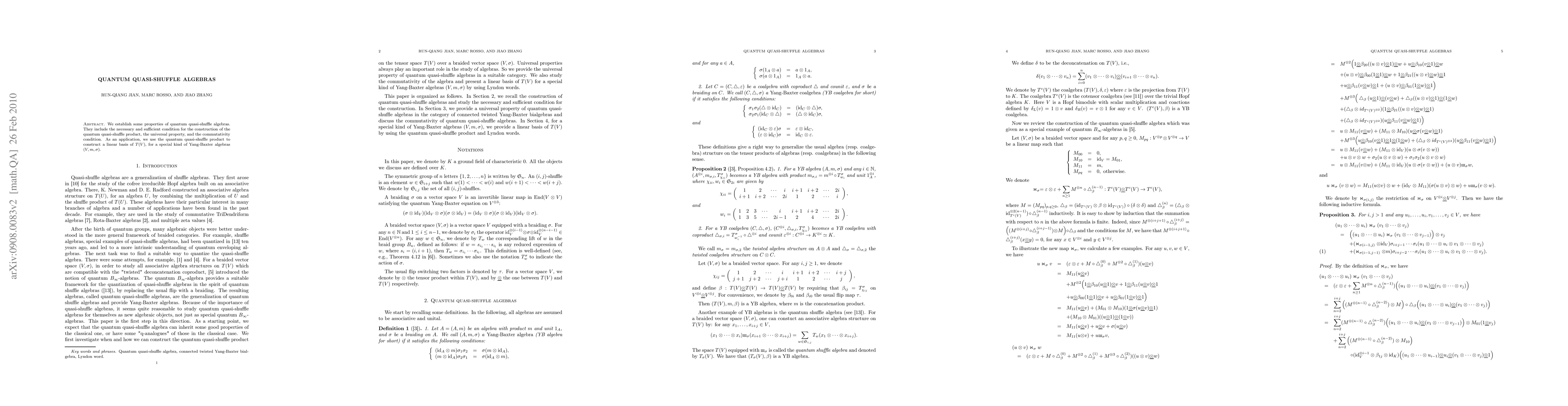 This paper establishes properties of quantum quasi-shuffle algebras, including a construction condition, universal property, and commutativity, and applies the quantum quasi-shuffle product to construct a linear basis for a specific Yang-Baxter algebra structure.