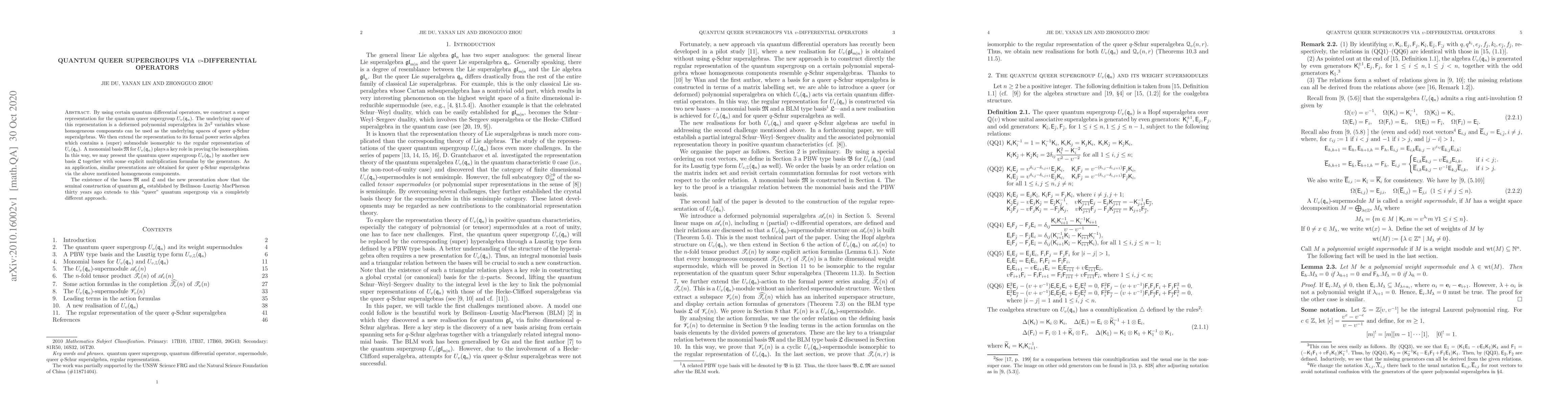 By using certain quantum differential operators, we construct a super representation for the quantum queer supergroup U_v(q_n). The underlying space of this representation is a deformed polynomial superalgebra in 2n^2 variables whose homogeneous components can be used as the underlying spaces of queer q-Schur superalgebras. We then extend the representation to its formal power series algebra which contains a (super) submodule isomorphic to the regular representation of U_v(q_n). A monomial basis M for U_v(q_n) plays a key role in proving the isomorphism. In this way, we may present the quantum queer supergroup U_v(q_n) by another new basis L together with some explicit multiplication formulas by the generators. As an application, similar presentations are obtained for queer q-Schur superalgebras via the above mentioned homogeneous components. The existence of the bases M and L and the new presentation show that the seminal construction of quantum gl_n established by Beilinson-Lusztig-MacPherson thirty years ago extends to this "queer" quantum supergroup via a completely different approach.