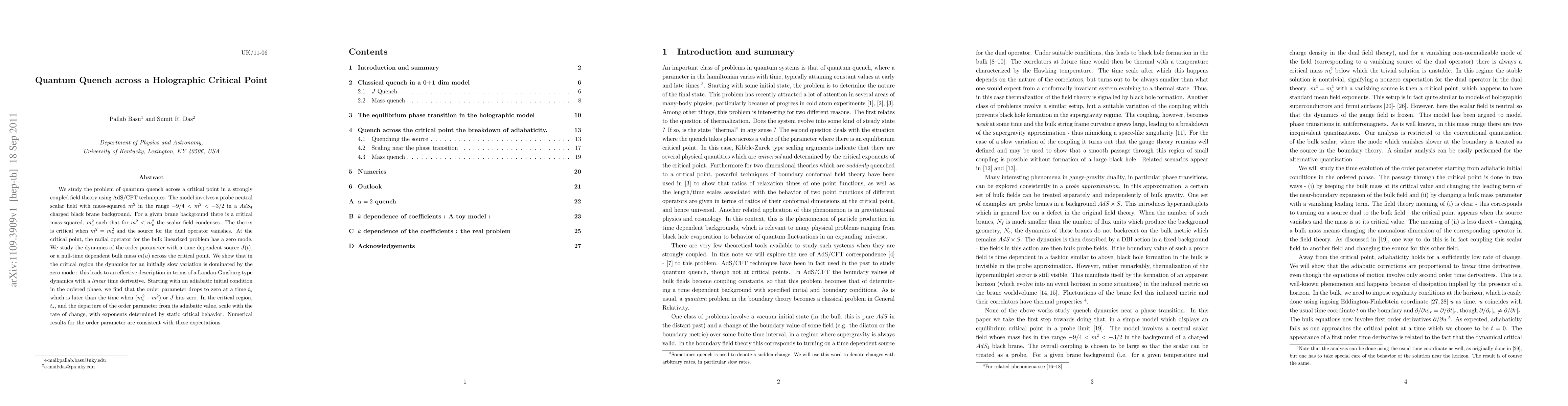 We study the problem of quantum quench across a critical point in a strongly coupled field theory using AdS/CFT techniques. The model involves a probe neutral scalar field with mass-squared $m^2$ in the range $-9/4 < m^2 < -3/2$ in a $AdS_4$ charged black brane background. For a given brane background there is a critical mass-squared, $m_c^2$ such that for $m^2 < m_c^2$ the scalar field condenses. The theory is critical when $m^2 = m_c^2$ and the source for the dual operator vanishes. At the critical point, the radial operator for the bulk linearized problem has a zero mode. We study the dynamics of the order parameter with a time dependent source $J(t)$, or a null-time dependent bulk mass $m(u)$ across the critical point. We show that in the critical region the dynamics for an initially slow variation is dominated by the zero mode : this leads to an effective description in terms of a Landau-Ginsburg type dynamics with a {\em linear} time derivative. Starting with an adiabatic initial condition in the ordered phase, we find that the order parameter drops to zero at a time $t_\star$ which is later than the time when $(m_c^2-m^2)$ or $J$ hits zero. In the critical region, $t_\star$, and the departure of the order parameter from its adiabatic value, scale with the rate of change, with exponents determined by static critical behavior. Numerical results for the order parameter are consistent with these expectations.