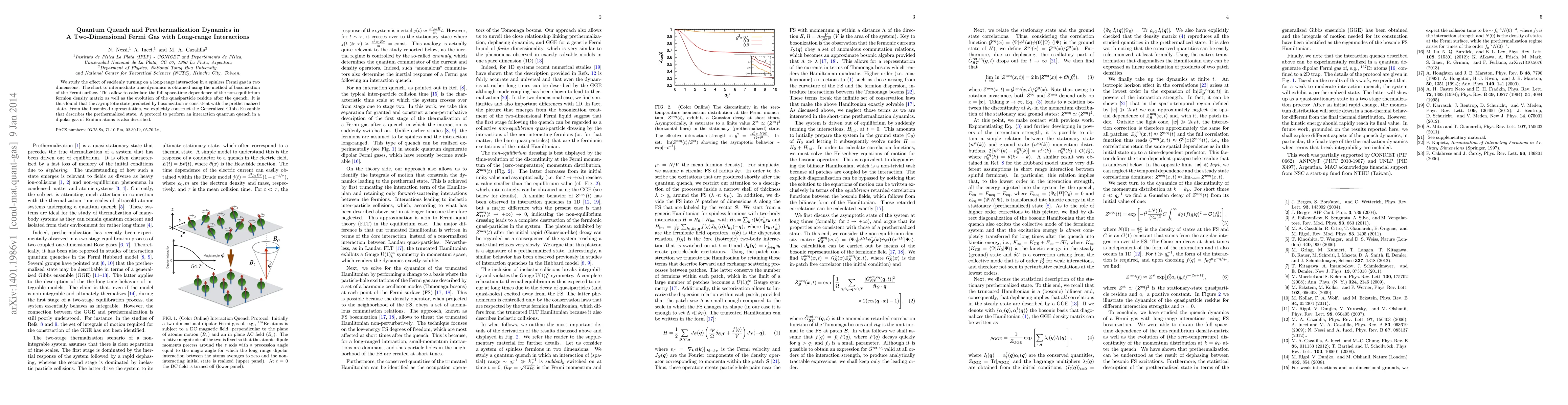 We study the effect of suddenly turning on a long-range interaction in a spinless Fermi gas in two dimensions. The short to intermediate time dynamics is obtained using the method of bosonization of the Fermi surface. This allow to calculate the full space-time dependence of the non-equilibrium fermion density matrix as well as the evolution of the quasiparticle residue after the quench. It is thus found that the asymptotic state predicted by bosonization is consistent with the prethermalized state. From the bosonized representation, we explicitly construct the Generalized Gibbs Ensamble that describes the prethermalized state. A protocol to perform an interaction quantum quench in a dipolar gas of Erbium atoms is also described.