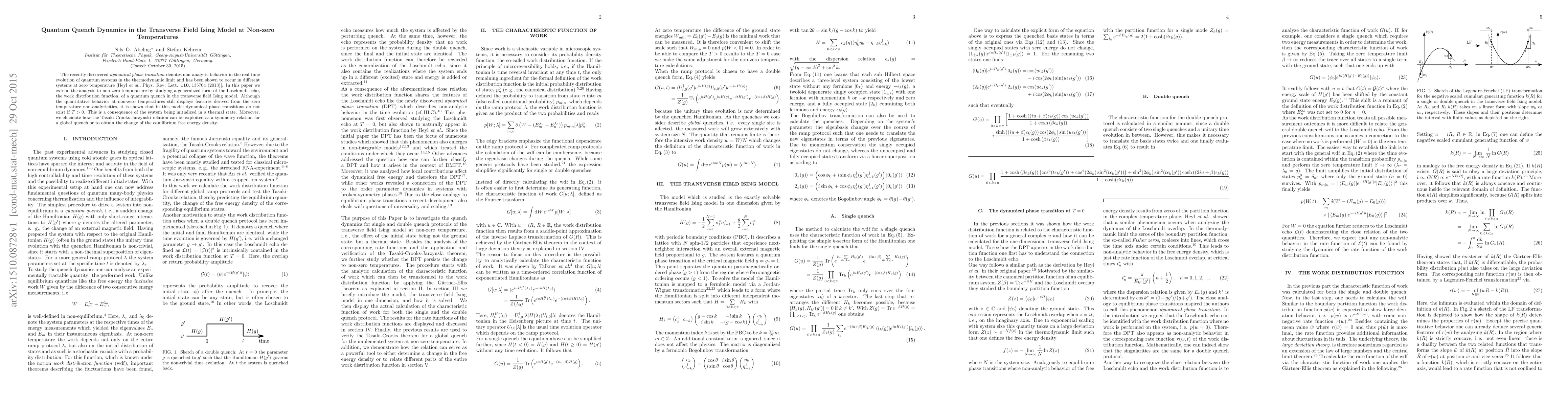 This paper investigates the dynamics of quantum quenches in the transverse field Ising model at non-zero temperatures, revealing that dynamical phase transitions do not occur when $T>0$ due to the system's thermal initialization. The study also explores the Tasaki-Crooks-Jarzynski relation for global quenches and equilibrium free energy density changes.