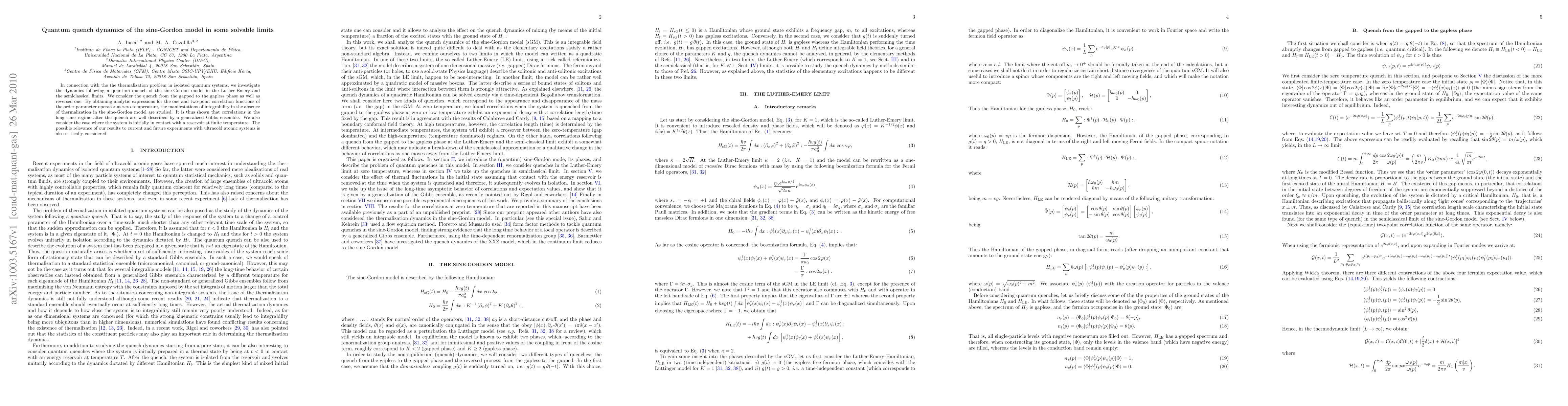 This paper studies the quantum quench dynamics of the sine-Gordon model in solvable limits, focusing on the transition between gapped and gapless phases. It reveals that integrability leads to non-thermalizing dynamics, with long-time correlations described by a generalized Gibbs ensemble, and discusses potential experimental relevance in ultracold atomic systems.