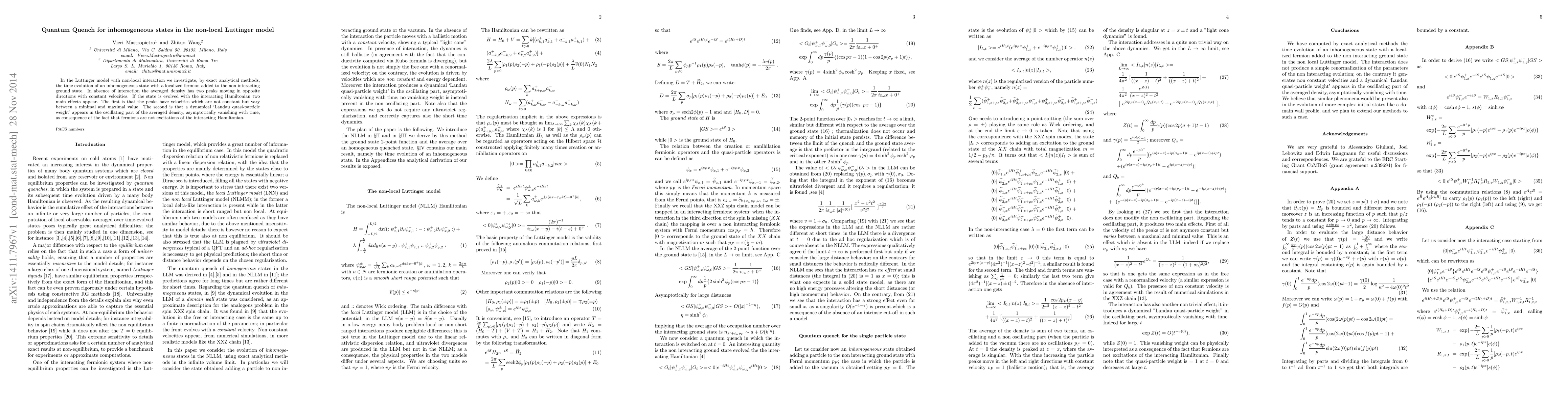 In the Luttinger model with non-local interaction we investigate, by exact analytical methods, the time evolution of an inhomogeneous state with a localized fermion added to the non interacting ground state. In absence of interaction the averaged density has two peaks moving in opposite directions with constant velocities. If the state is evolved with the interacting Hamiltonian two main effects appear. The first is that the peaks have velocities which are not constant but vary between a minimal and maximal value. The second is that a dynamical `Landau quasi-particle weight' appears in the oscillating part of the averaged density, asymptotically vanishing with time, as consequence of the fact that fermions are not excitations of the interacting Hamiltonian.