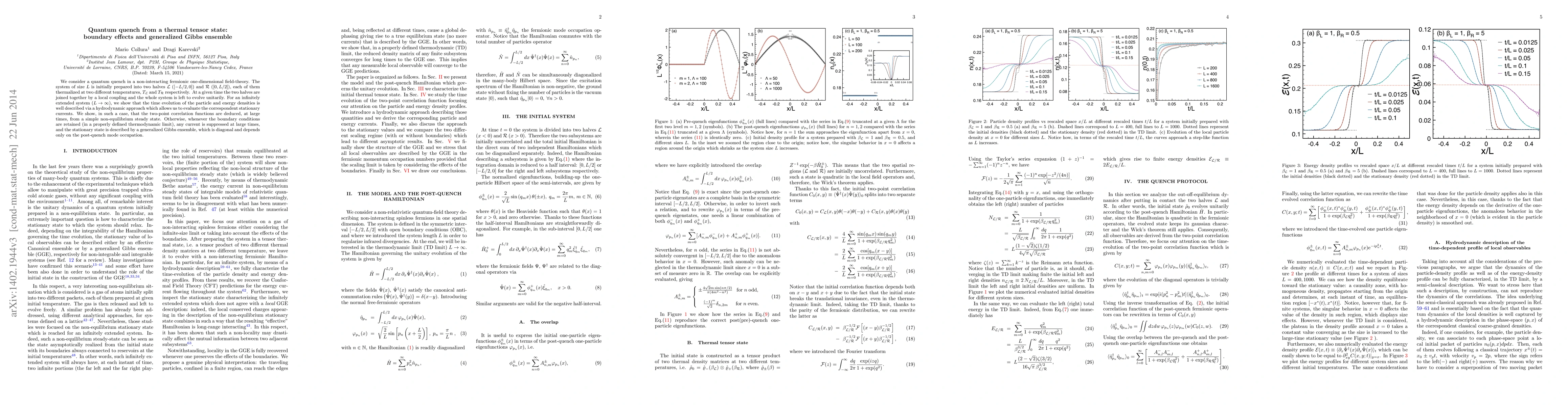 We consider a quantum quench in a non-interacting fermionic one-dimensional field-theory. The system of size $L$ is initially prepared into two halves $\mathcal{L}$ ($[-L/2,0]$) and $\mathcal{R}$ ($[0,L/2]$), each of them thermalized at two different temperatures, ${T_{L}}$ and ${T_{R}}$ respectively. At a given time the two halves are joined together by a local coupling and the whole system is left to evolve unitarily. For an infinitely extended system ($L\rightarrow \infty$), we show that the time evolution of the particle and energy densities is well described via a hydrodynamic approach which allows us to evaluate the correspondent stationary currents. We show, in such a case, that the two-point correlation functions are deduced, at large times, from a simple non-equilibrium steady state. Otherwise, whenever the boundary conditions are retained (in a properly defined thermodynamic limit), any current is suppressed at large times, and the stationary state is described by a generalized Gibbs ensemble, which is diagonal and depends only on the post-quench mode occupation.