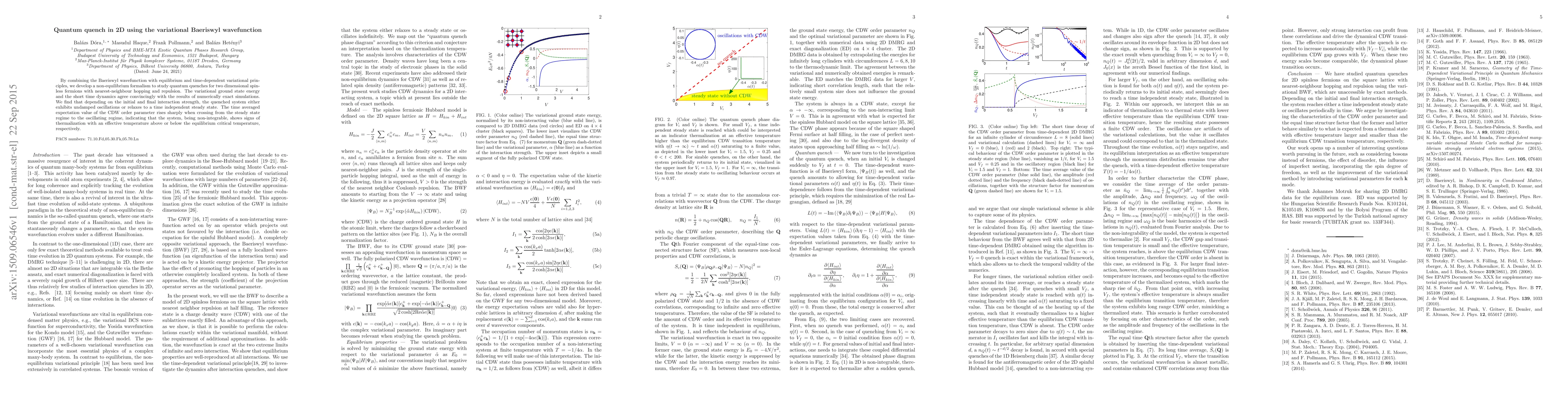 This paper develops a variational approach using the Baeriswyl wavefunction to study quantum quenches in 2D spinless fermions, revealing that the system can either oscillate undamped or relax to a steady state depending on interaction strengths. The study shows a sharp rise in the CDW order parameter when transitioning from steady state to oscillating behavior, indicating thermalization.