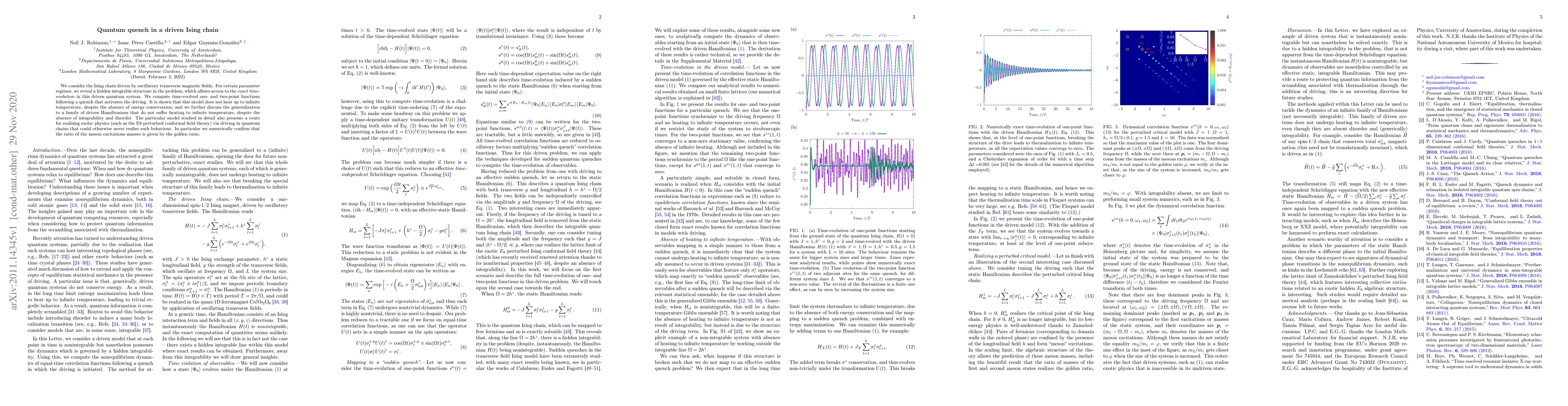 We consider the Ising chain driven by oscillatory transverse magnetic fields. For certain parameter regimes, we reveal a hidden integrable structure in the problem, which allows access to the \textit{exact time-evolution} in this driven quantum system. We compute time-evolved one- and two-point functions following a quench that activates the driving. It is shown that this model does not heat up to infinite temperature, despite the absence of energy conservation, and we further discuss the generalization to a family of driven Hamiltonians that do not suffer heating to infinite temperature, despite the absence of integrability and disorder. The particular model studied in detail also presents a route for realising exotic physics (such as the E8 perturbed conformal field theory) via driving in quantum chains that could otherwise never realise such behaviour. In particular we numerically confirm that the ratio of the meson excitations masses is given by the golden ratio.