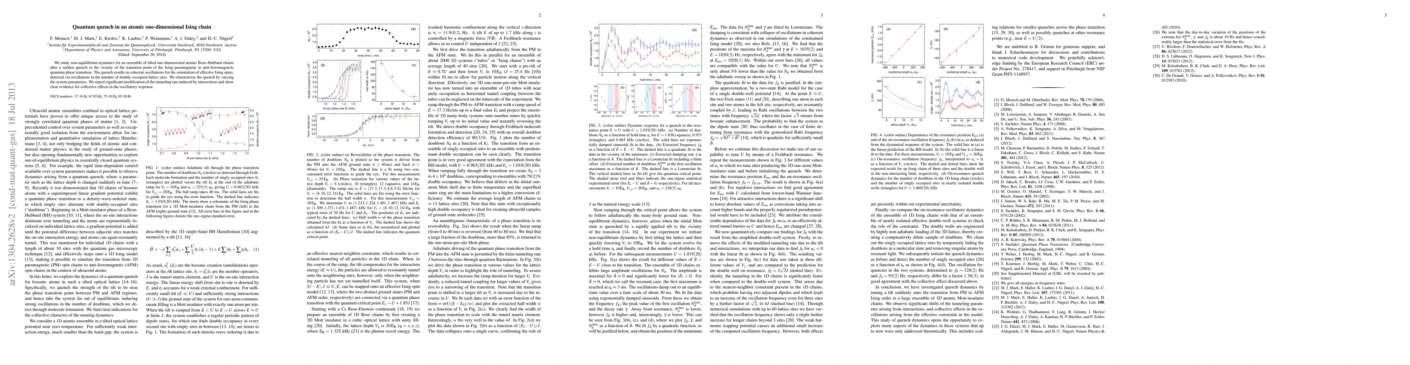 We study non-equilibrium dynamics for an ensemble of tilted one-dimensional atomic Bose-Hubbard chains after a sudden quench to the vicinity of the transition point of the Ising paramagnetic to anti-ferromagnetic quantum phase transition. The quench results in coherent oscillations for the orientation of effective Ising spins, detected via oscillations in the number of doubly-occupied lattice sites. We characterize the quench by varying the system parameters. We report significant modification of the tunneling rate induced by interactions and show clear evidence for collective effects in the oscillatory response.
