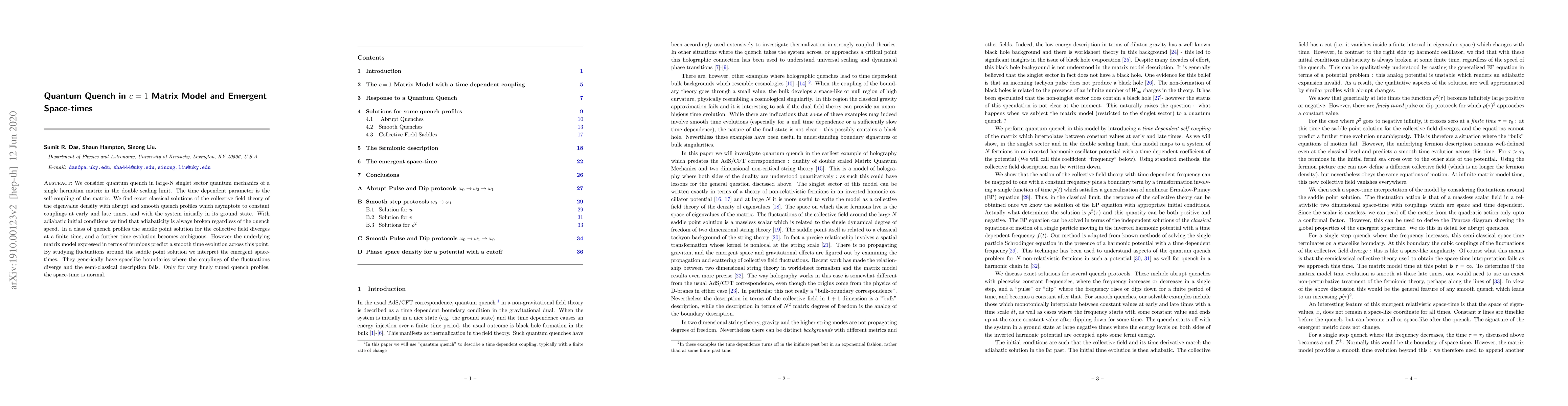 We consider quantum quench in large-N singlet sector quantum mechanics of a single hermitian matrix in the double scaling limit. The time dependent parameter is the self-coupling of the matrix. We find exact classical solutions of the collective field theory of eigenvalue density with abrupt smooth quench profiles which asymptote to constant couplings at early and late times, and the system is initially in its ground state. With adiabatic initial conditions we find that adiabaticity is always broken regardless of the quench speed. In a class of quench profiles the saddle point solution for the collective field diverges at a finite time, and a further time evolution becomes ambiguous. However the underlying matrix model expressed in terms of fermions predict a smooth time evolution across this point. By studying fluctuations around the saddle point solution we interpret the emergent space-times. They generically have spacelike boundaries where the couplings of the fluctuations diverge. Only for very finely tuned quench profiles, the space-time is normal.