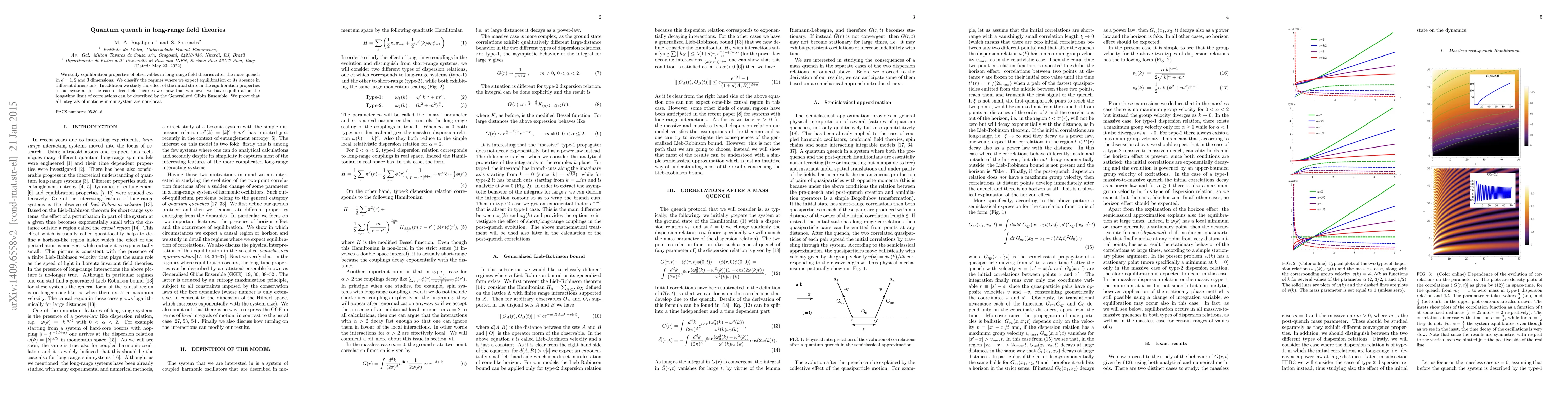 Researchers studied how particles in long-range field theories behave after a sudden change in mass, finding that equilibration properties vary by dimension and initial state, with some systems exhibiting non-local behavior.