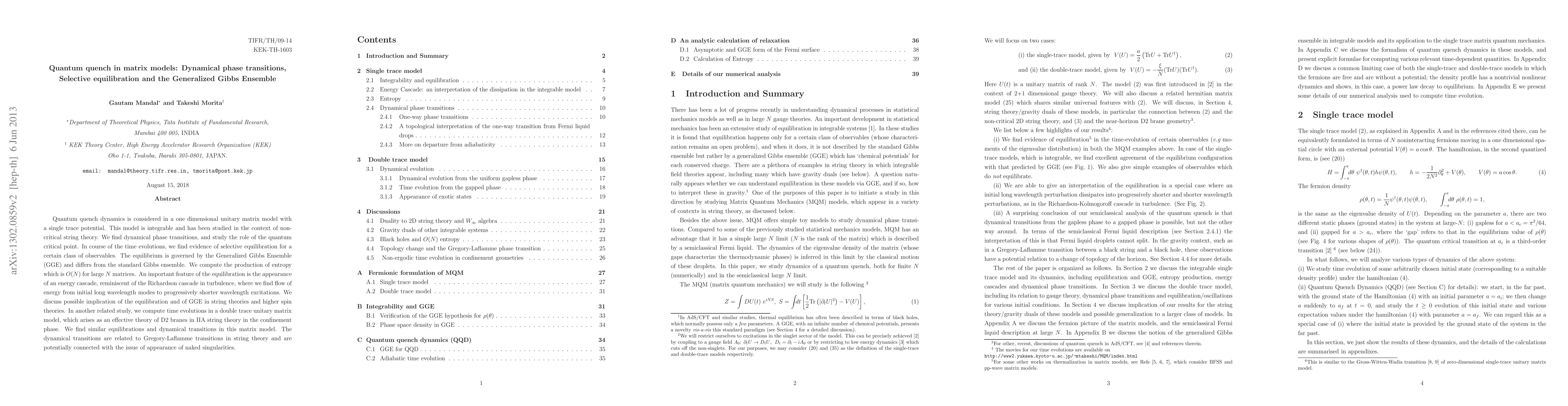 This paper investigates quantum quench dynamics in integrable matrix models, revealing dynamical phase transitions and selective equilibration governed by the Generalized Gibbs Ensemble. It finds an energy cascade similar to turbulence and discusses implications for string theories and higher spin theories.