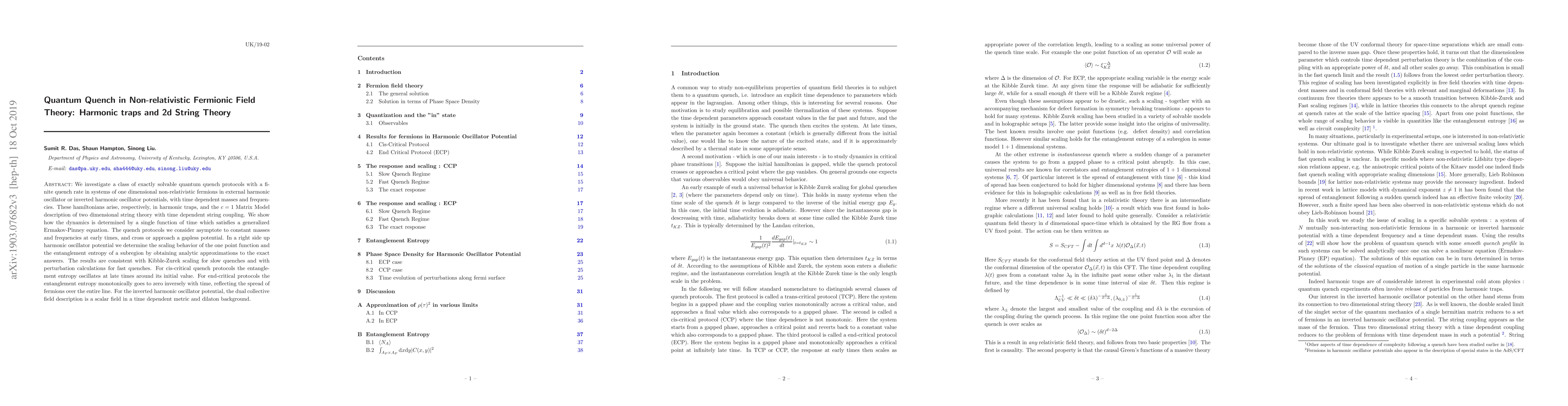 Researchers studied quantum quench protocols in non-relativistic fermions under harmonic traps and 2D string theory, finding scaling behaviors of entanglement entropy that match Kibble-Zurek predictions for slow quenches and perturbation calculations for fast quenches.