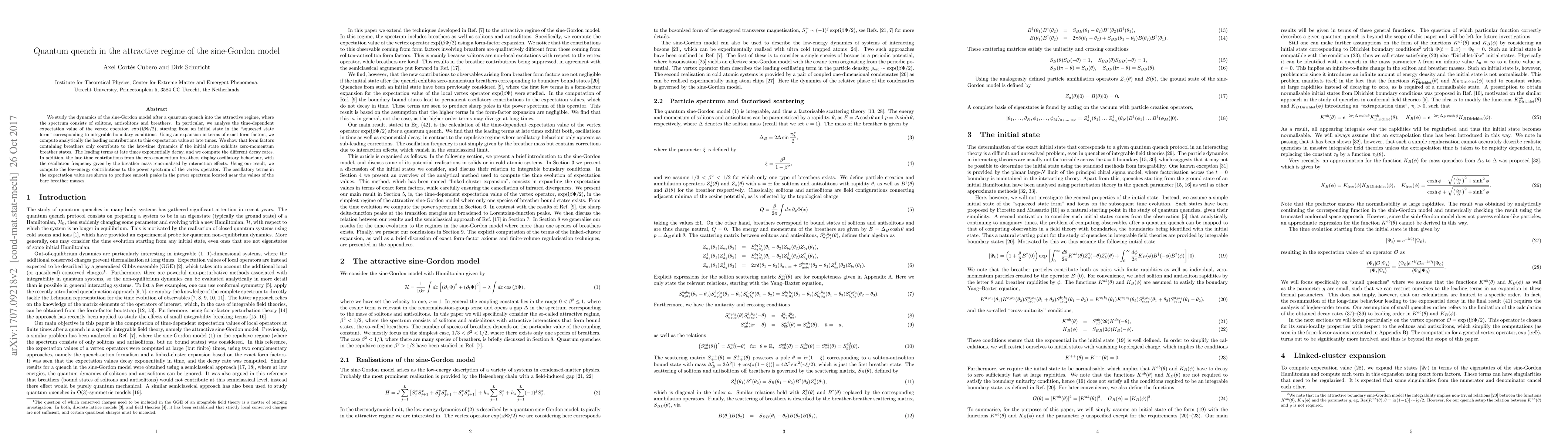 This paper investigates the dynamics of the sine-Gordon model post-quantum quench into its attractive regime, focusing on the time-dependent expectation value of a vertex operator. It reveals that breathers contribute to late-time decay only if the initial state has zero-momentum breathers, leading to oscillatory behavior in the decay rate.