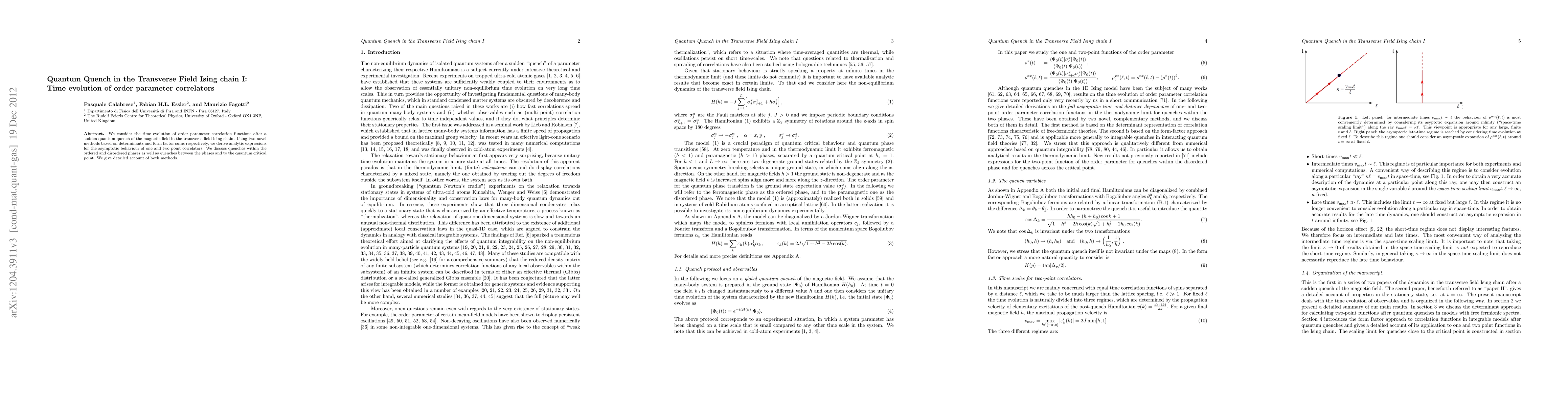 This paper investigates the time evolution of order parameter correlation functions following a quantum quench in the transverse field Ising chain. It employs two novel analytical methods to derive expressions for the asymptotic behavior of one and two point correlators, examining quenches within and between ordered and disordered phases.
