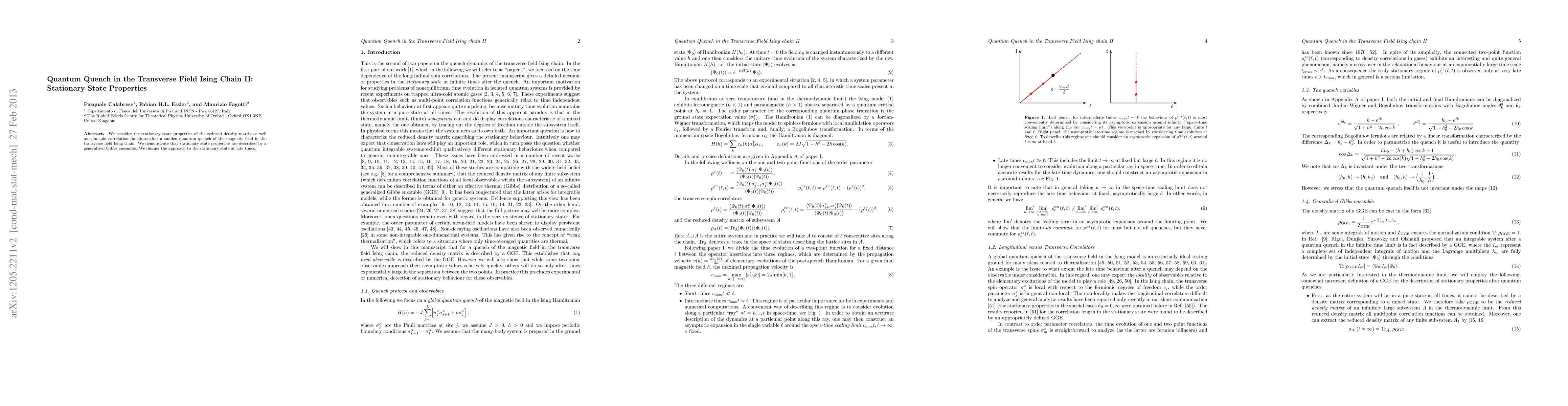 This paper investigates the stationary state properties following a quantum quench in the transverse field Ising chain, showing that these properties are described by a generalized Gibbs ensemble. It also explores the dynamics leading to the stationary state as time progresses.
