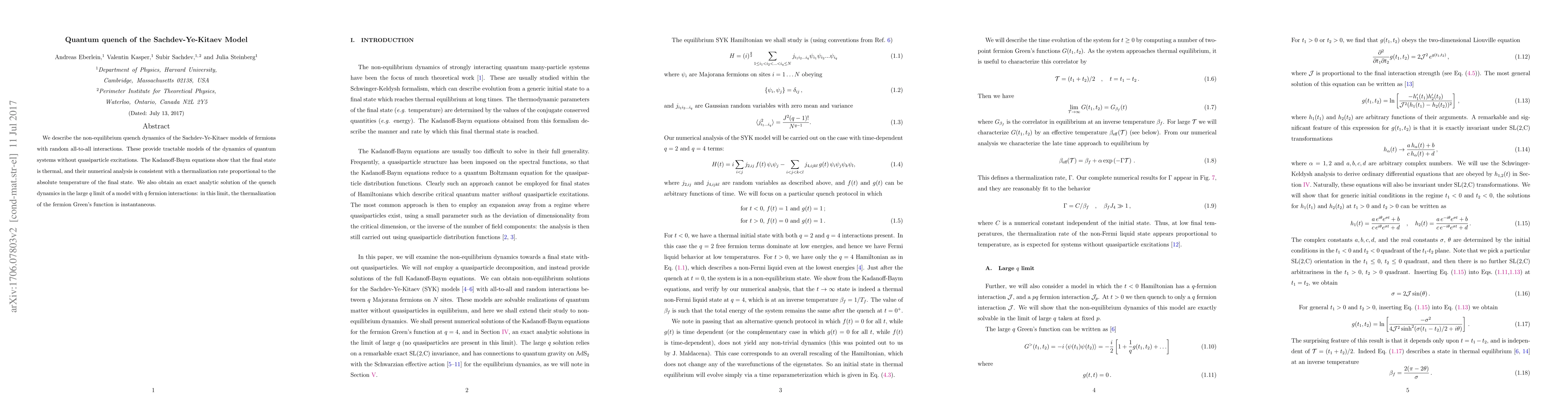 This paper investigates the non-equilibrium dynamics of the Sachdev-Ye-Kitaev model, revealing that the system thermalizes with a rate proportional to the final state temperature. An exact analytic solution for large fermion interaction limits shows instantaneous thermalization of the fermion Green's function.