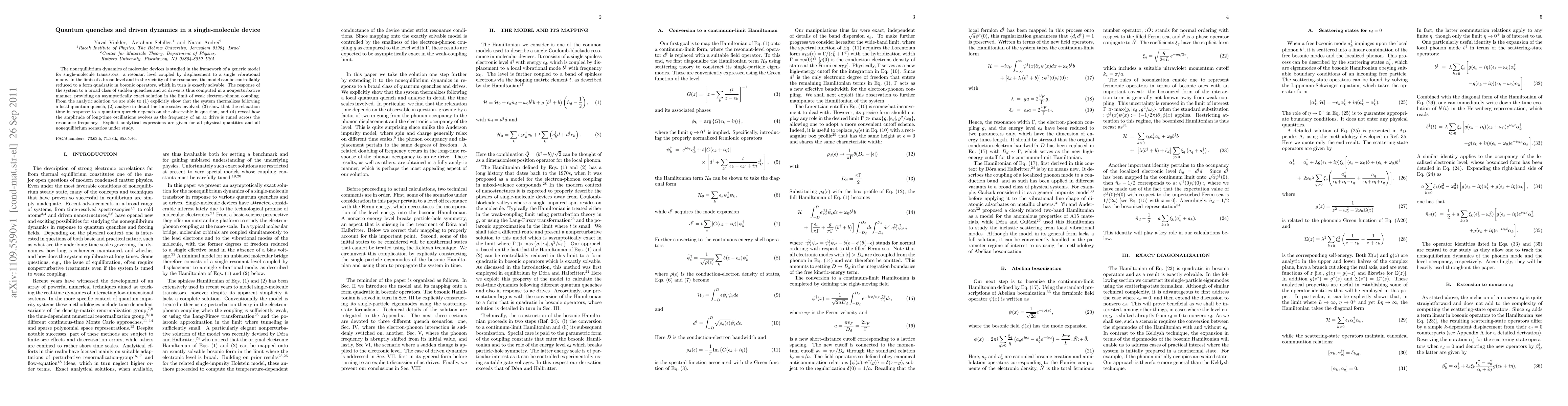 The nonequilibrium dynamics of molecular devices is studied in the framework of a generic model for single-molecule transistors: a resonant level coupled by displacement to a single vibrational mode. In the limit of a broad level and in the vicinity of the resonance, the model can be controllably reduced to a form quadratic in bosonic operators, which in turn is exactly solvable. The response of the system to a broad class of sudden quenches and ac drives is thus computed in a nonperturbative manner, providing an asymptotically exact solution in the limit of weak electron-phonon coupling. From the analytic solution we are able to (1) explicitly show that the system thermalizes following a local quantum quench, (2) analyze in detail the time scales involved, (3) show that the relaxation time in response to a quantum quench depends on the observable in question, and (4) reveal how the amplitude of long-time oscillations evolves as the frequency of an ac drive is tuned across the resonance frequency. Explicit analytical expressions are given for all physical quantities and all nonequilibrium scenarios under study.