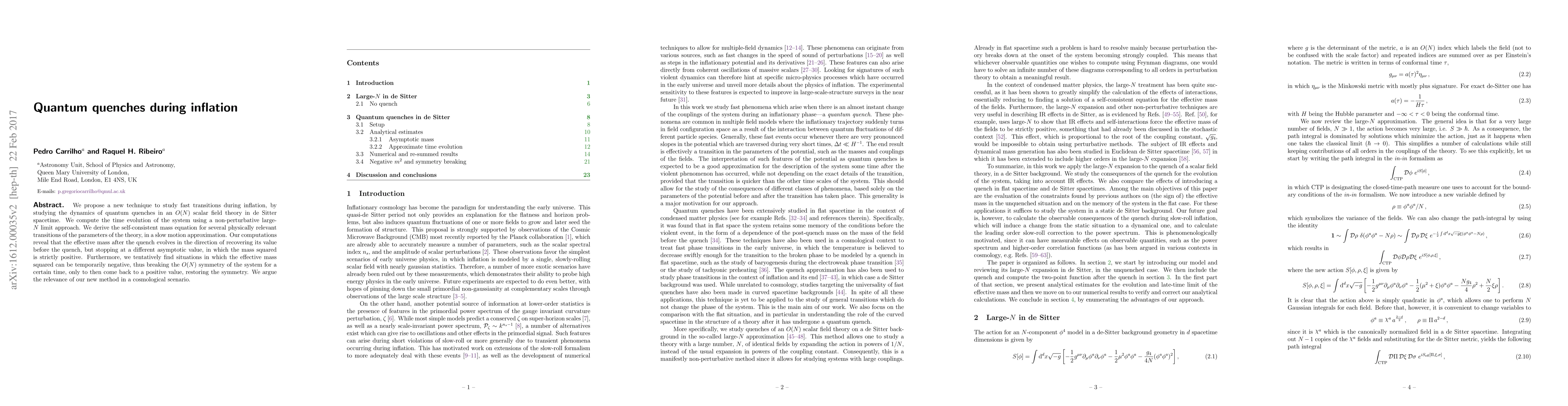 We propose a new technique to study fast transitions during inflation, by studying the dynamics of quantum quenches in an $O(N)$ scalar field theory in de Sitter spacetime. We compute the time evolution of the system using a non-perturbative large-$N$ limit approach. We derive the self-consistent mass equation for several physically relevant transitions of the parameters of the theory, in a slow motion approximation. Our computations reveal that the effective mass after the quench evolves in the direction of recovering its value before the quench, but stopping at a different asymptotic value, in which the mass squared is strictly positive. Furthermore, we tentatively find situations in which the effective mass squared can be temporarily negative, thus breaking the $O(N)$ symmetry of the system for a certain time, only to then come back to a positive value, restoring the symmetry. We argue the relevance of our new method in a cosmological scenario.