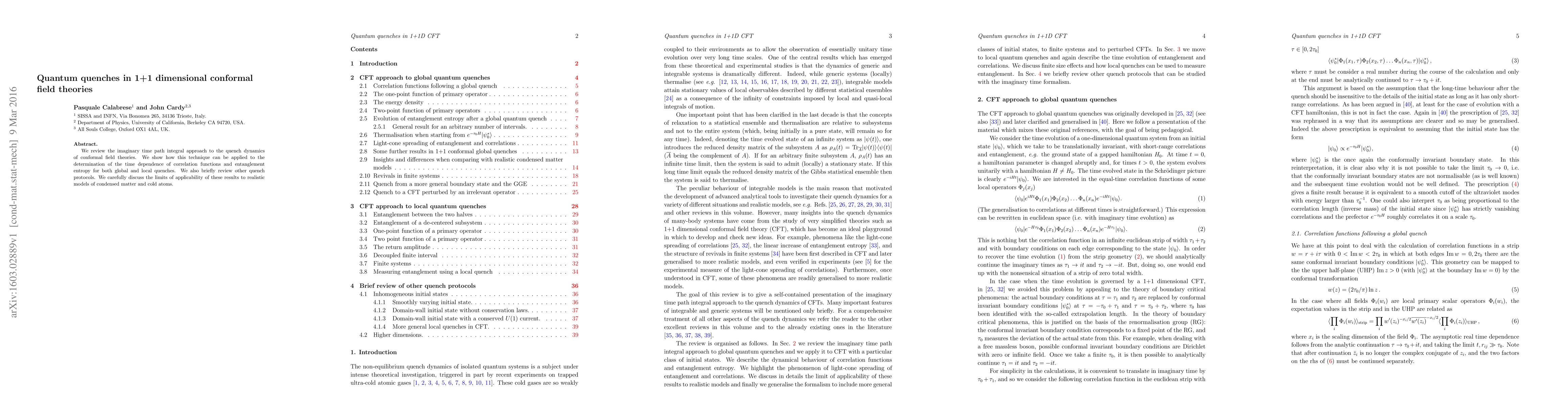 This paper reviews the use of imaginary time path integrals to study quantum quenches in 1+1 dimensional conformal field theories, focusing on the time dependence of correlation functions and entanglement entropy. It also discusses the applicability of these methods to real-world condensed matter and cold atom systems.