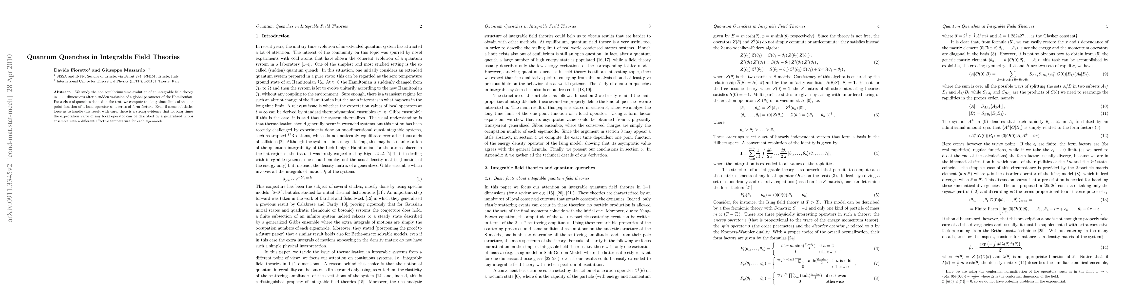 This paper investigates the non-equilibrium dynamics of 1+1 dimensional integrable field theories following a sudden change in a Hamiltonian parameter. The study reveals that long after the quench, local operator expectation values can be described by a generalized Gibbs ensemble with an effective temperature for each eigenmode.
