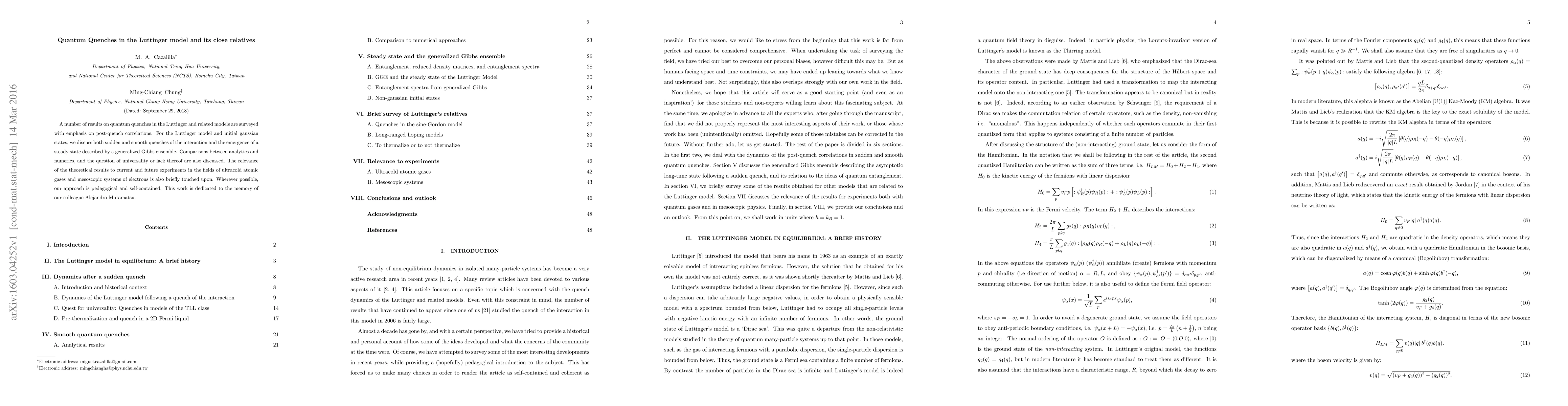 A number of results on quantum quenches in the Luttinger and related models are surveyed with emphasis on post-quench correlations. For the Luttinger model and initial gaussian states, we discuss both sudden and smooth quenches of the interaction and the emergence of a steady state described by a generalized Gibbs ensemble. Comparisons between analytics and numerics, and the question of universality or lack thereof are also discussed. The relevance of the theoretical results to current and future experiments in the fields of ultracold atomic gases and mesoscopic systems of electrons is also briefly touched upon. Wherever possible, our approach is pedagogical and self-contained. This work is dedicated to the memory of our colleague Alejandro Muramatsu.