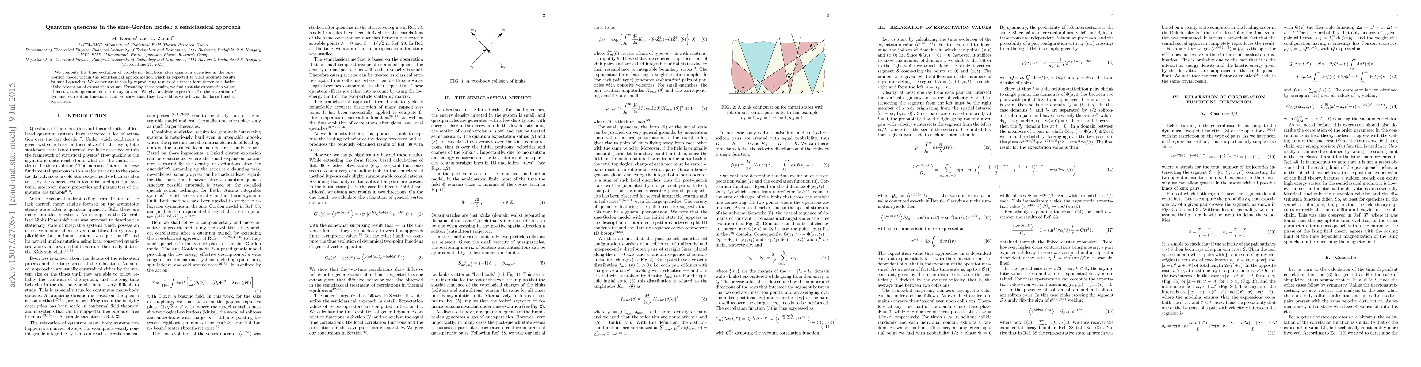 This paper investigates the time evolution of correlation functions following quantum quenches in the sine-Gordon model using a semiclassical approach, finding that most vertex operators' expectation values do not decay to zero. The study reveals diffusive behavior in the relaxation of dynamic correlation functions for large timelike separations.